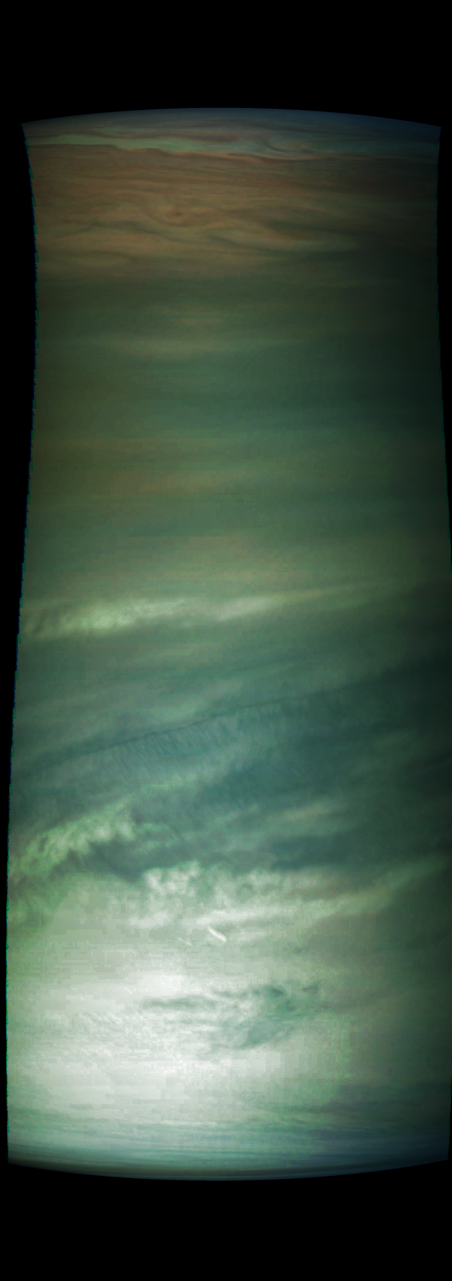 Junocam pixels are 12 bits deep from the camera but are converted to 8 bits inside the instrument using a lossless "companding" table, a process similar to gamma correction, to reduce their size. All Junocam products on the missionjuno website are in this 8-bit form as received on Earth. Scientific users interested in radiometric analysis should use the "RDR" data products archived with the Planetary Data System, which have been converted back to a linear 12-bit scale.