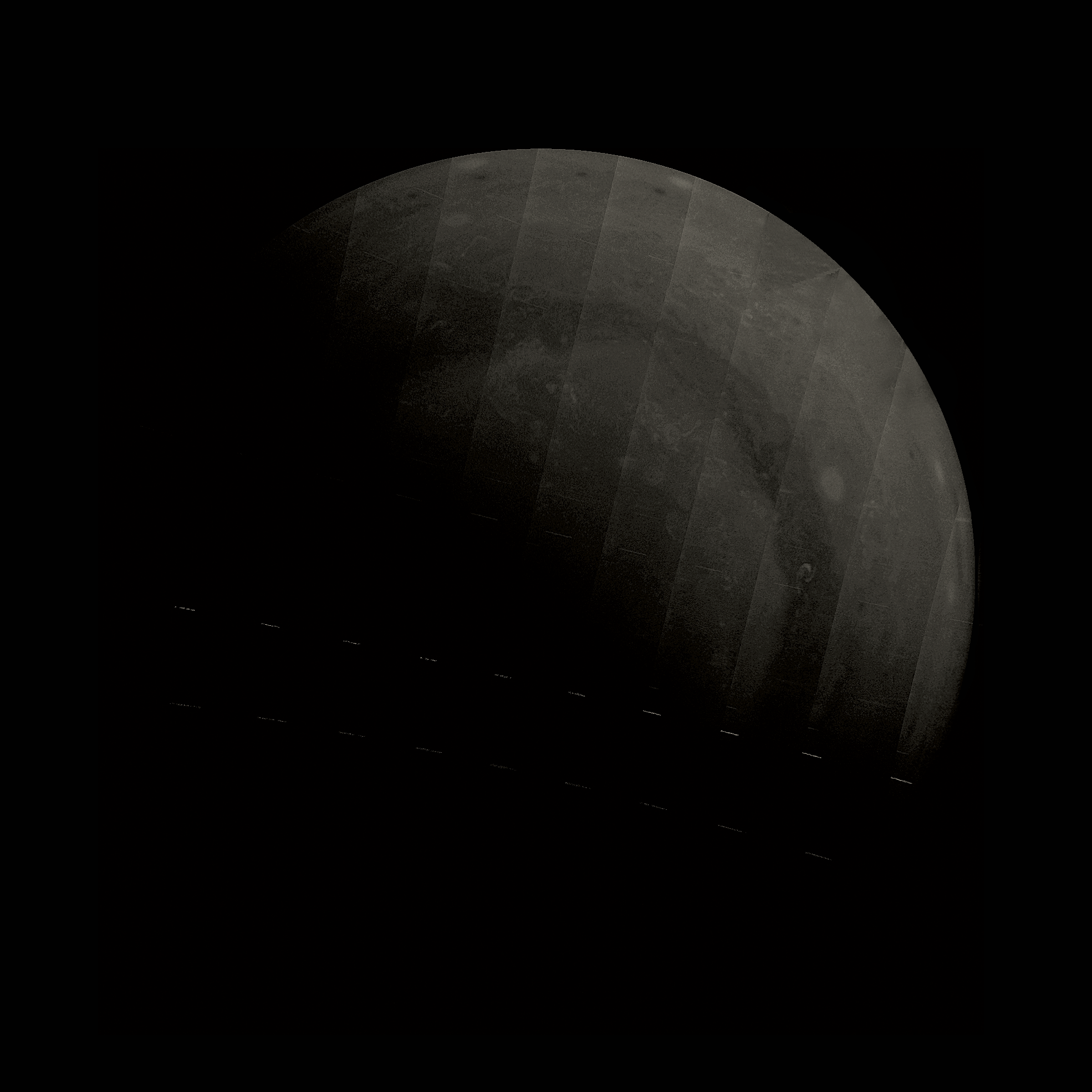 Level-corrected, sharpened image with warming filter for detail. Some approximate filling in/cloning of pixels in top right sector (arc of approx 1 rad, close to circumference) to account for rendering issues in the original images.