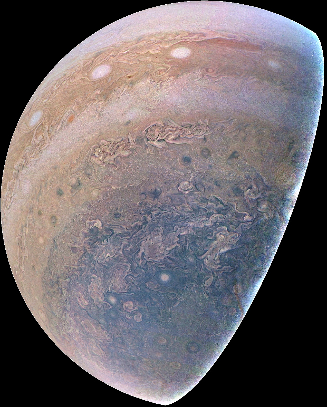 Junocam pixels are 12 bits deep from the camera but are converted to 8 bits inside the instrument using a lossless "companding" table, a process similar to gamma correction, to reduce their size. All Junocam products on the missionjuno website are in this 8-bit form as received on Earth. Scientific users interested in radiometric analysis should use the "RDR" data products archived with the Planetary Data System, which have been converted back to a linear 12-bit scale.