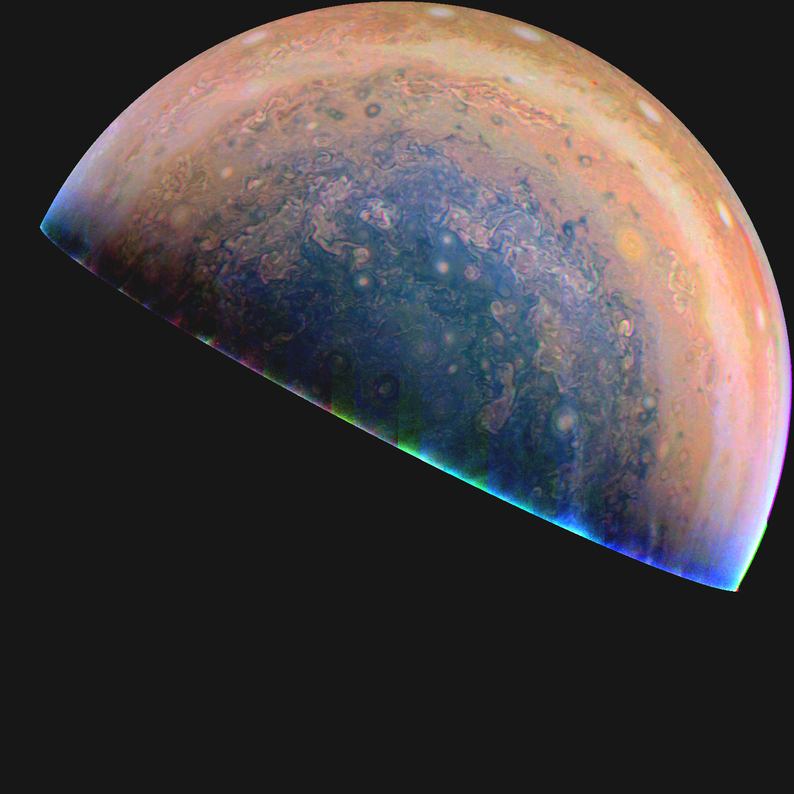 Junocam pixels are 12 bits deep from the camera but are converted to 8 bits inside the instrument using a lossless "companding" table, a process similar to gamma correction, to reduce their size. All Junocam products on the missionjuno website are in this 8-bit form as received on Earth. Scientific users interested in radiometric analysis should use the "RDR" data products archived with the Planetary Data System, which have been converted back to a linear 12-bit scale.