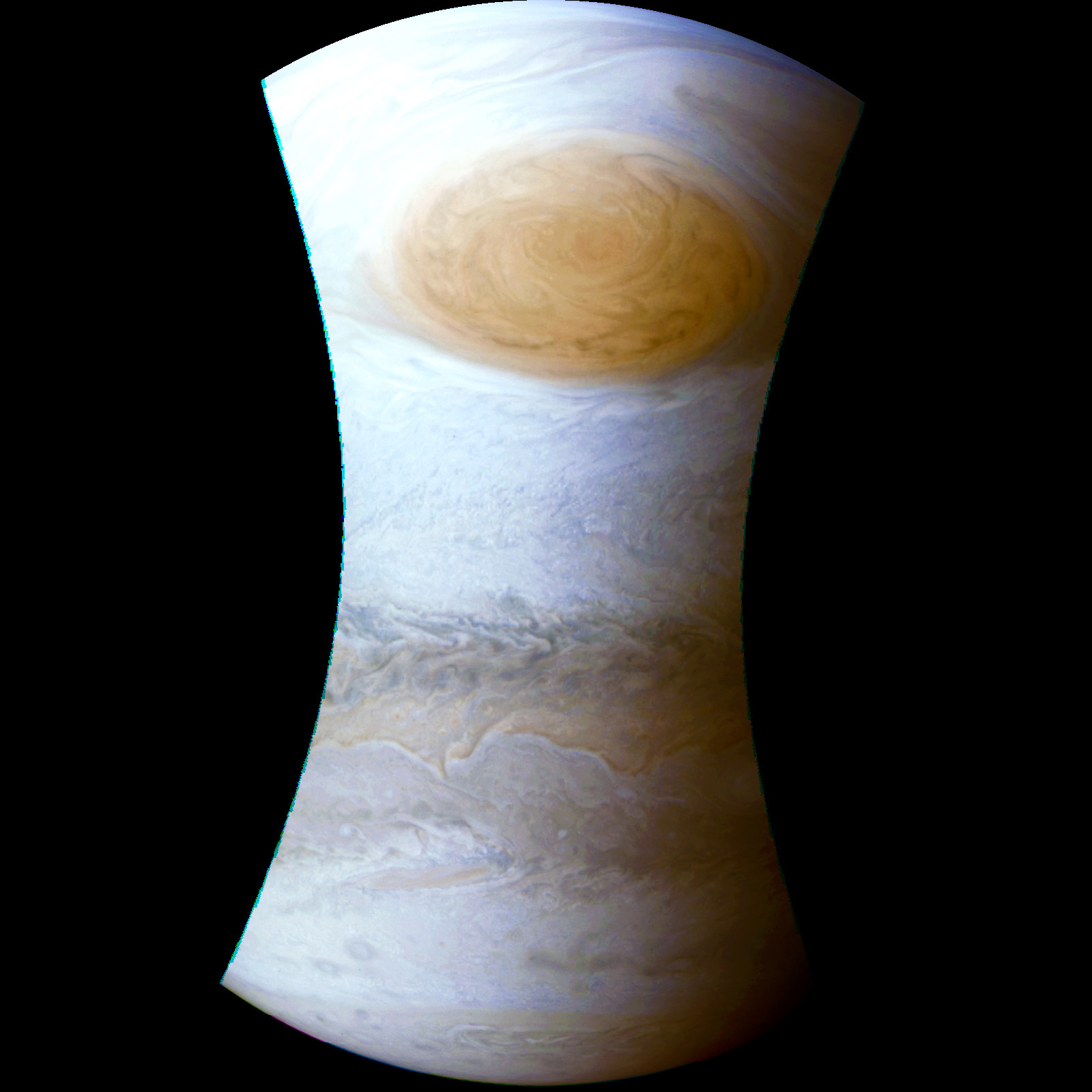 Junocam pixels are 12 bits deep from the camera but are converted to 8 bits inside the instrument using a lossless "companding" table, a process similar to gamma correction, to reduce their size. All Junocam products on the missionjuno website are in this 8-bit form as received on Earth. Scientific users interested in radiometric analysis should use the "RDR" data products archived with the Planetary Data System, which have been converted back to a linear 12-bit scale.