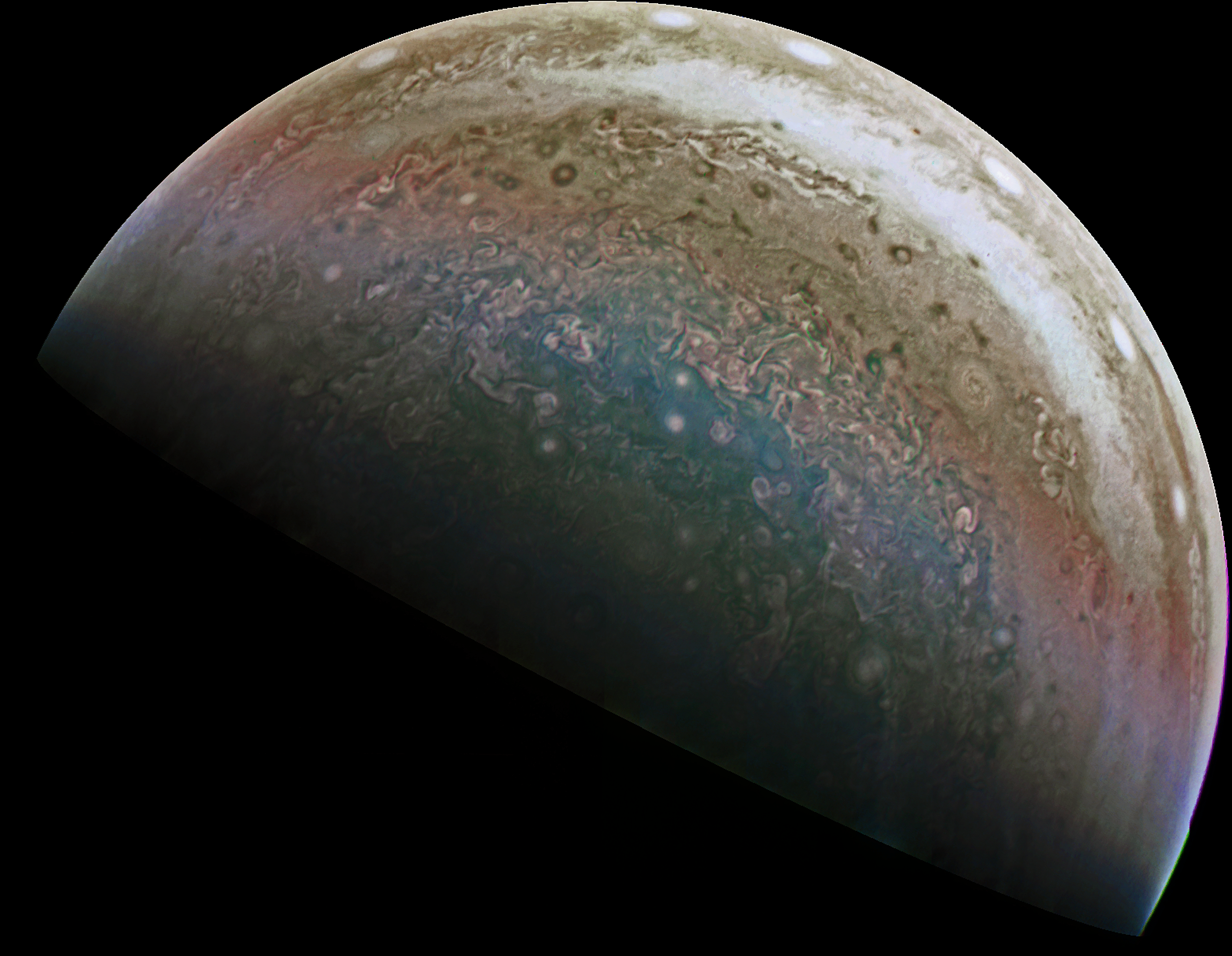 Junocam pixels are 12 bits deep from the camera but are converted to 8 bits inside the instrument using a lossless "companding" table, a process similar to gamma correction, to reduce their size. All Junocam products on the missionjuno website are in this 8-bit form as received on Earth. Scientific users interested in radiometric analysis should use the "RDR" data products archived with the Planetary Data System, which have been converted back to a linear 12-bit scale.