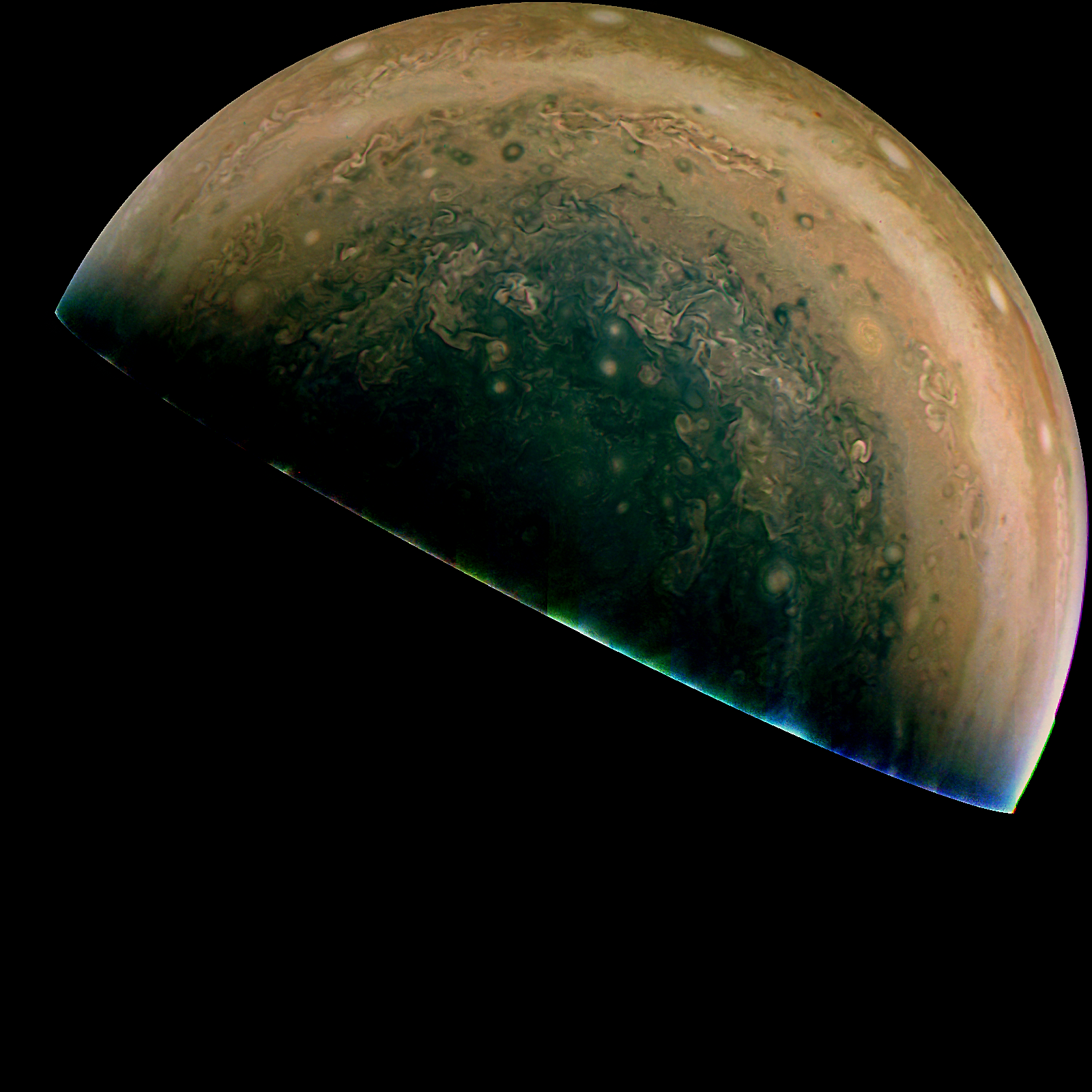 Junocam pixels are 12 bits deep from the camera but are converted to 8 bits inside the instrument using a lossless "companding" table, a process similar to gamma correction, to reduce their size. All Junocam products on the missionjuno website are in this 8-bit form as received on Earth. Scientific users interested in radiometric analysis should use the "RDR" data products archived with the Planetary Data System, which have been converted back to a linear 12-bit scale.