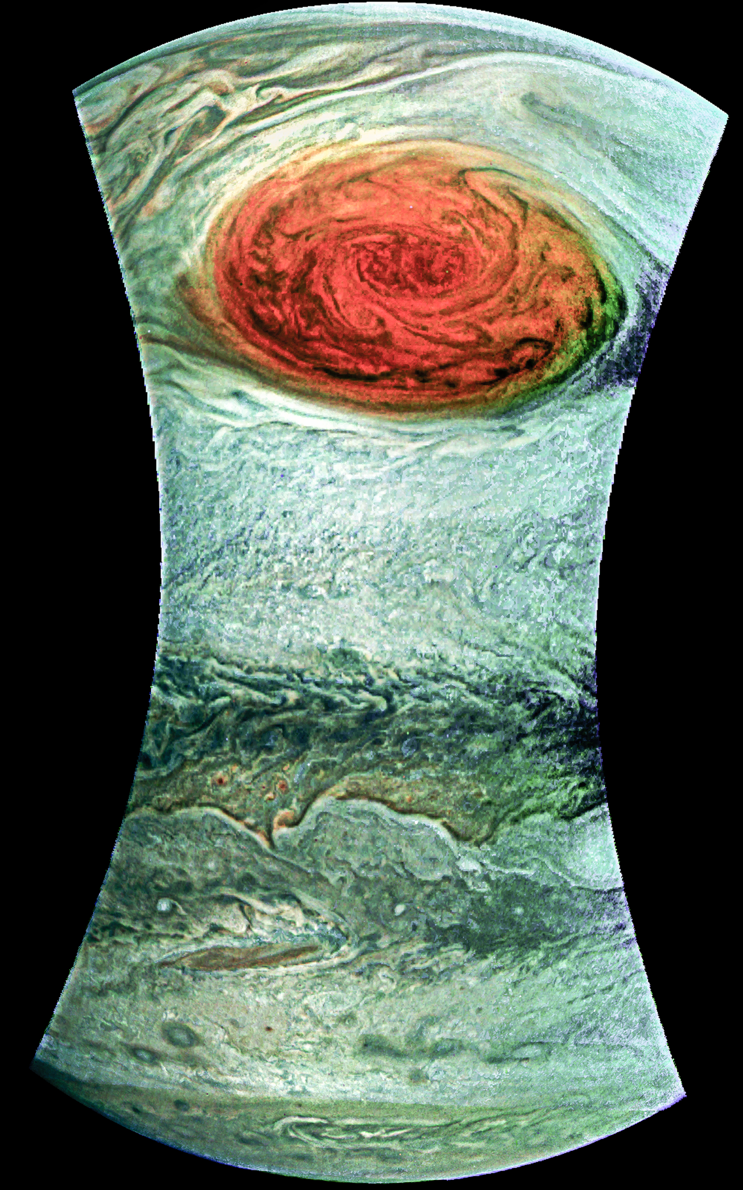 Junocam pixels are 12 bits deep from the camera but are converted to 8 bits inside the instrument using a lossless "companding" table, a process similar to gamma correction, to reduce their size. All Junocam products on the missionjuno website are in this 8-bit form as received on Earth. Scientific users interested in radiometric analysis should use the "RDR" data products archived with the Planetary Data System, which have been converted back to a linear 12-bit scale.