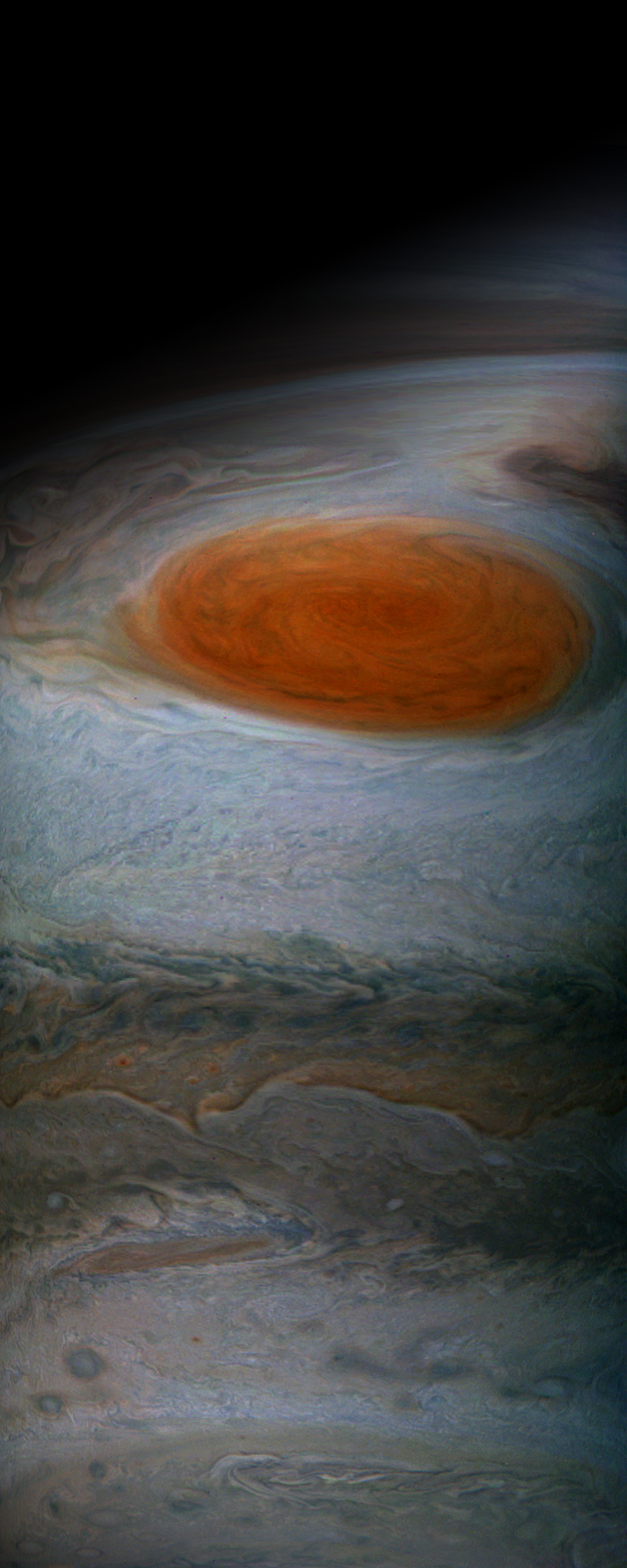 Perijove 7 - 2017-07-11 . Images of The Great Red Spot at T02:03 and T02:13 - combined and warped to rectangular shape. Top region heavy warped and then darkness cropping. Some contrast and level adjustment + sharpening.
