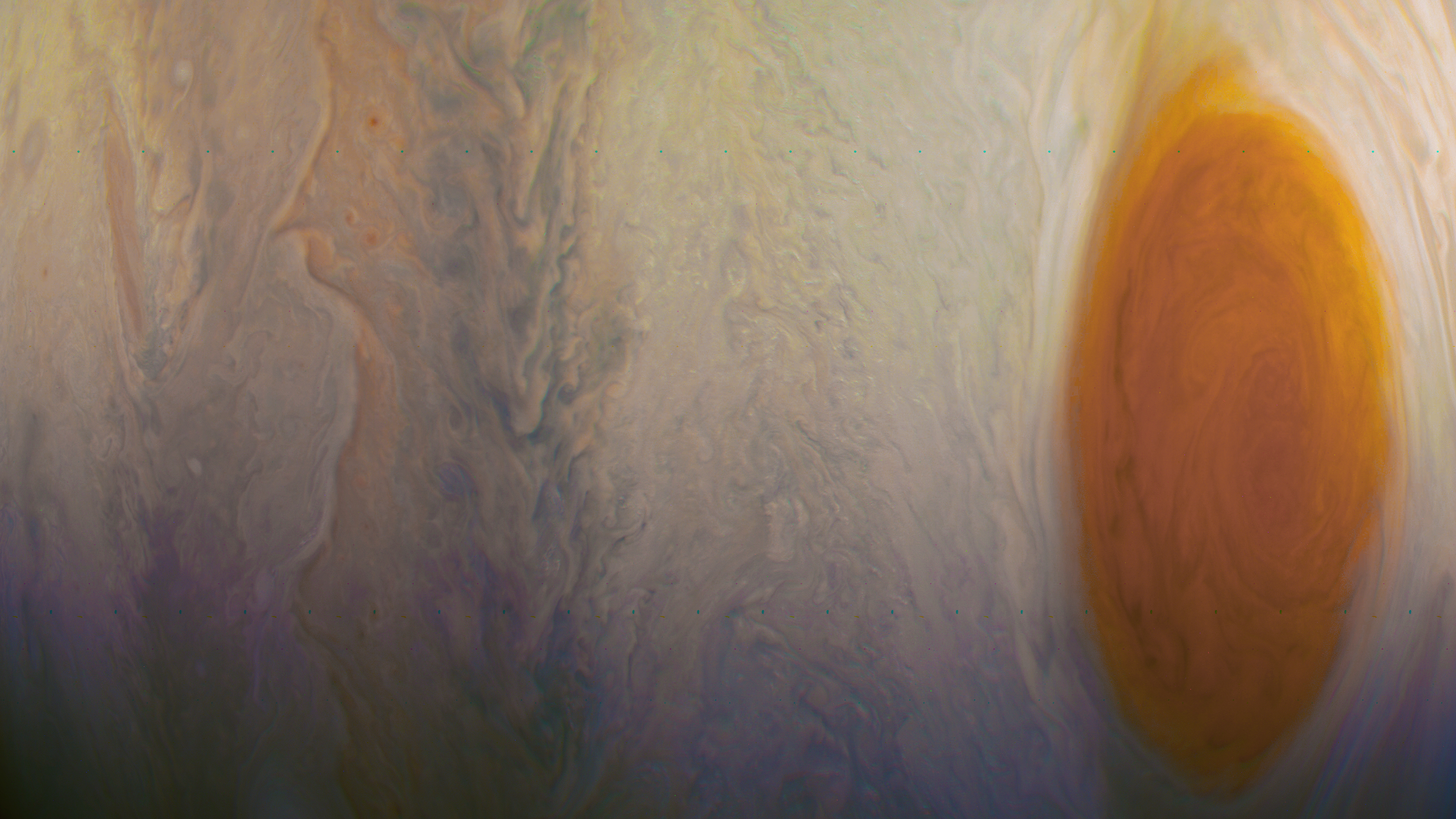 Junocam pixels are 12 bits deep from the camera but are converted to 8 bits inside the instrument using a lossless "companding" table, a process similar to gamma correction, to reduce their size. All Junocam products on the missionjuno website are in this 8-bit form as received on Earth. Scientific users interested in radiometric analysis should use the "RDR" data products archived with the Planetary Data System, which have been converted back to a linear 12-bit scale.