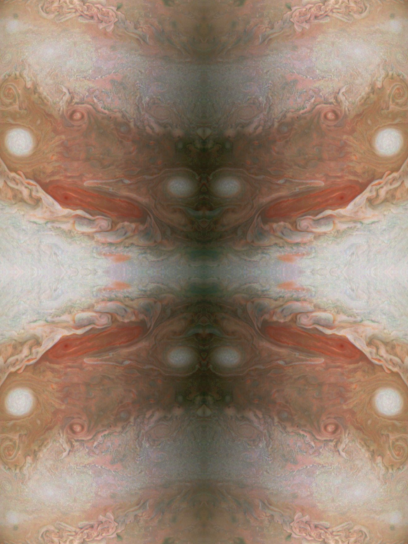 Being a hobbyist woodworker as well as an amateur photographer I immediately saw a resemblance to the wild grain patterns of wood burls when I looked at all the swirls and eddies of the storm on Jupiter. Burls are often sliced into thin veneers and adjacent slices then "matched" to create beautiful symmetrical patterns. These matched veneer sheets are then adhered to an engineered wood (plywood, MDF) substrate and used as table tops or some other flat panel application. This image is simply a digital version of the same process, after one of the original raw images underwent some minor enhancement. Thank you NASA for making these images available for the public do this sort of thing!