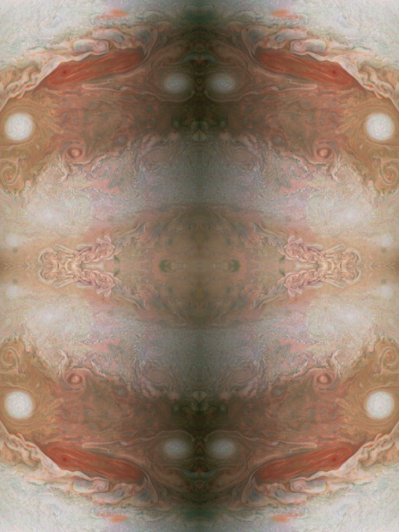 Being a hobbyist woodworker as well as an amateur photographer I immediately saw a resemblance to the wild grain patterns of wood burls when I looked at all the swirls and eddies of the storm on Jupiter. Burls are often sliced into thin veneers and adjacent slices then "matched" to create beautiful symmetrical patterns. These matched veneer sheets are then adhered to an engineered wood (plywood, MDF) substrate and used as table tops or some other flat panel application. This image is simply a digital version of the same process, after one of the original raw images underwent some minor enhancement. Thank you NASA for making these images available for the public do this sort of thing!