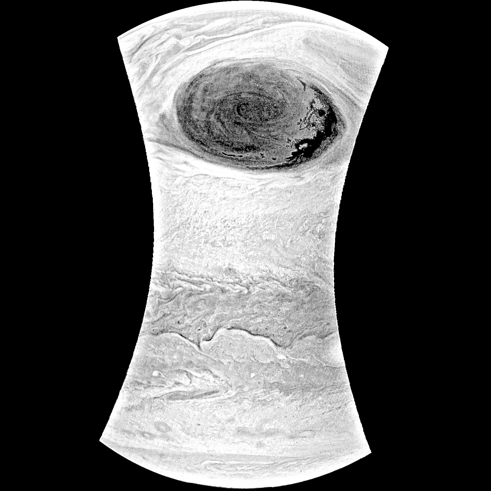 Junocam pixels are 12 bits deep from the camera but are converted to 8 bits inside the instrument using a lossless "companding" table, a process similar to gamma correction, to reduce their size. All Junocam products on the missionjuno website are in this 8-bit form as received on Earth. Scientific users interested in radiometric analysis should use the "RDR" data products archived with the Planetary Data System, which have been converted back to a linear 12-bit scale.