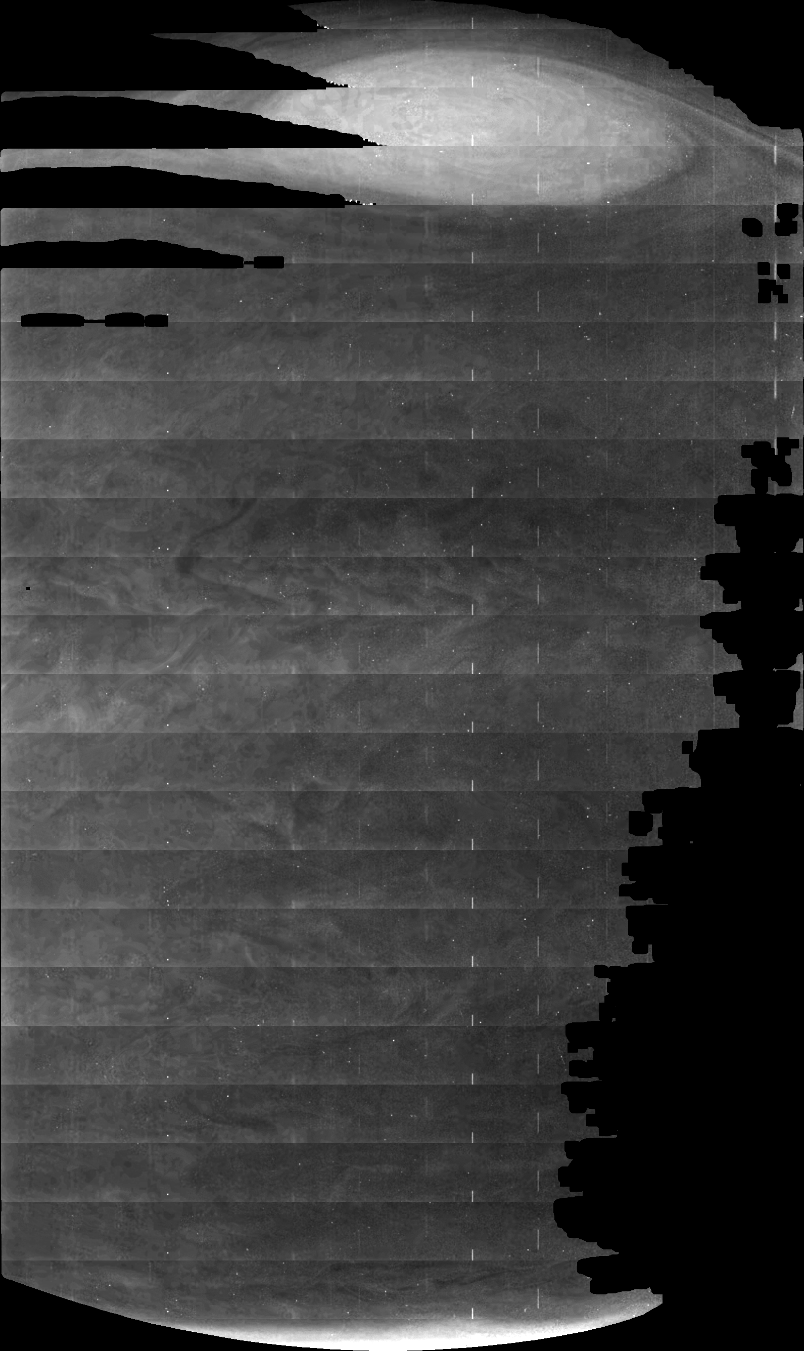 Junocam pixels are 12 bits deep from the camera but are converted to 8 bits inside the instrument using a lossless "companding" table, a process similar to gamma correction, to reduce their size. All Junocam products on the missionjuno website are in this 8-bit form as received on Earth. Scientific users interested in radiometric analysis should use the "RDR" data products archived with the Planetary Data System, which have been converted back to a linear 12-bit scale.