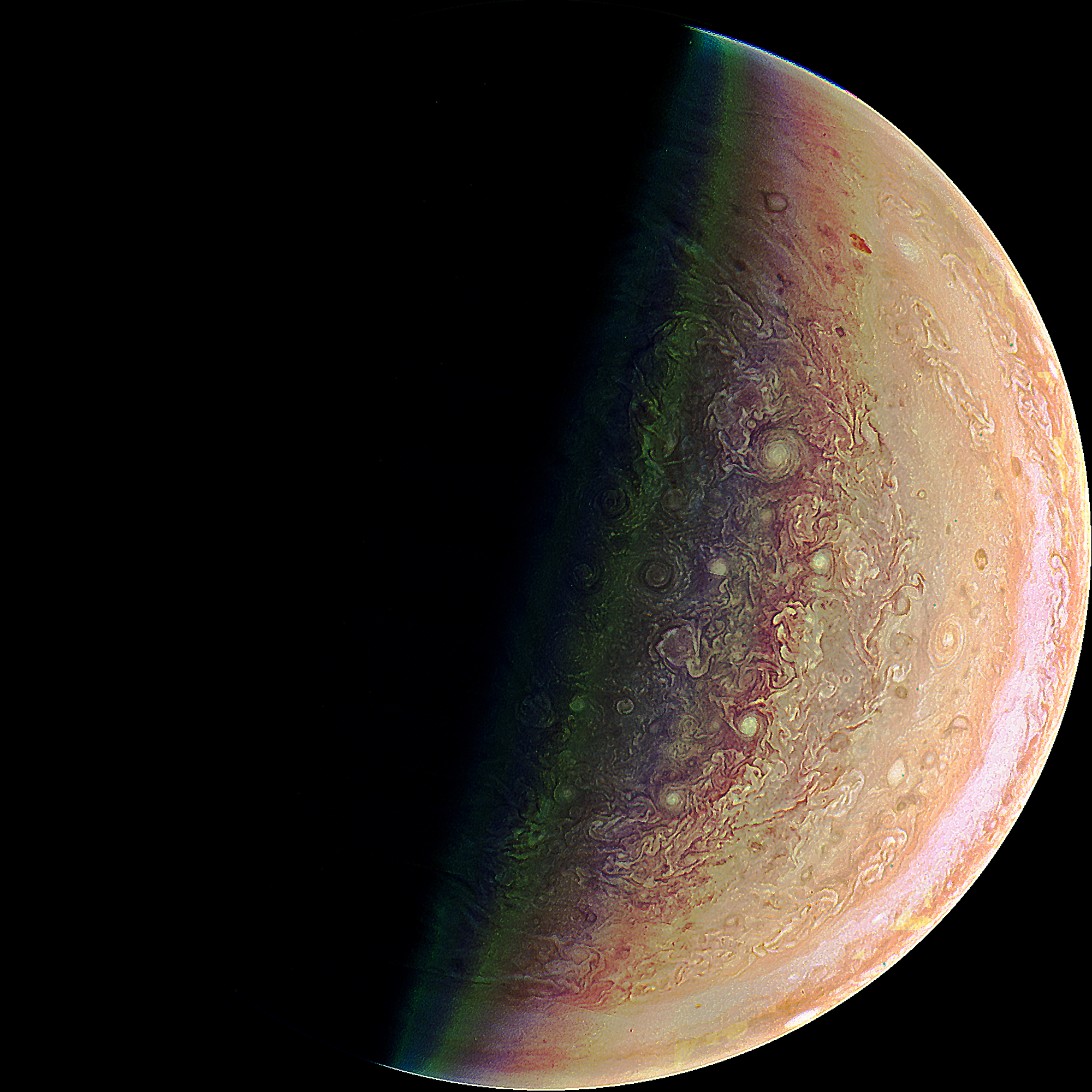 Junocam pixels are 12 bits deep from the camera but are converted to 8 bits inside the instrument using a lossless "companding" table, a process similar to gamma correction, to reduce their size. All Junocam products on the missionjuno website are in this 8-bit form as received on Earth. Scientific users interested in radiometric analysis should use the "RDR" data products archived with the Planetary Data System, which have been converted back to a linear 12-bit scale.