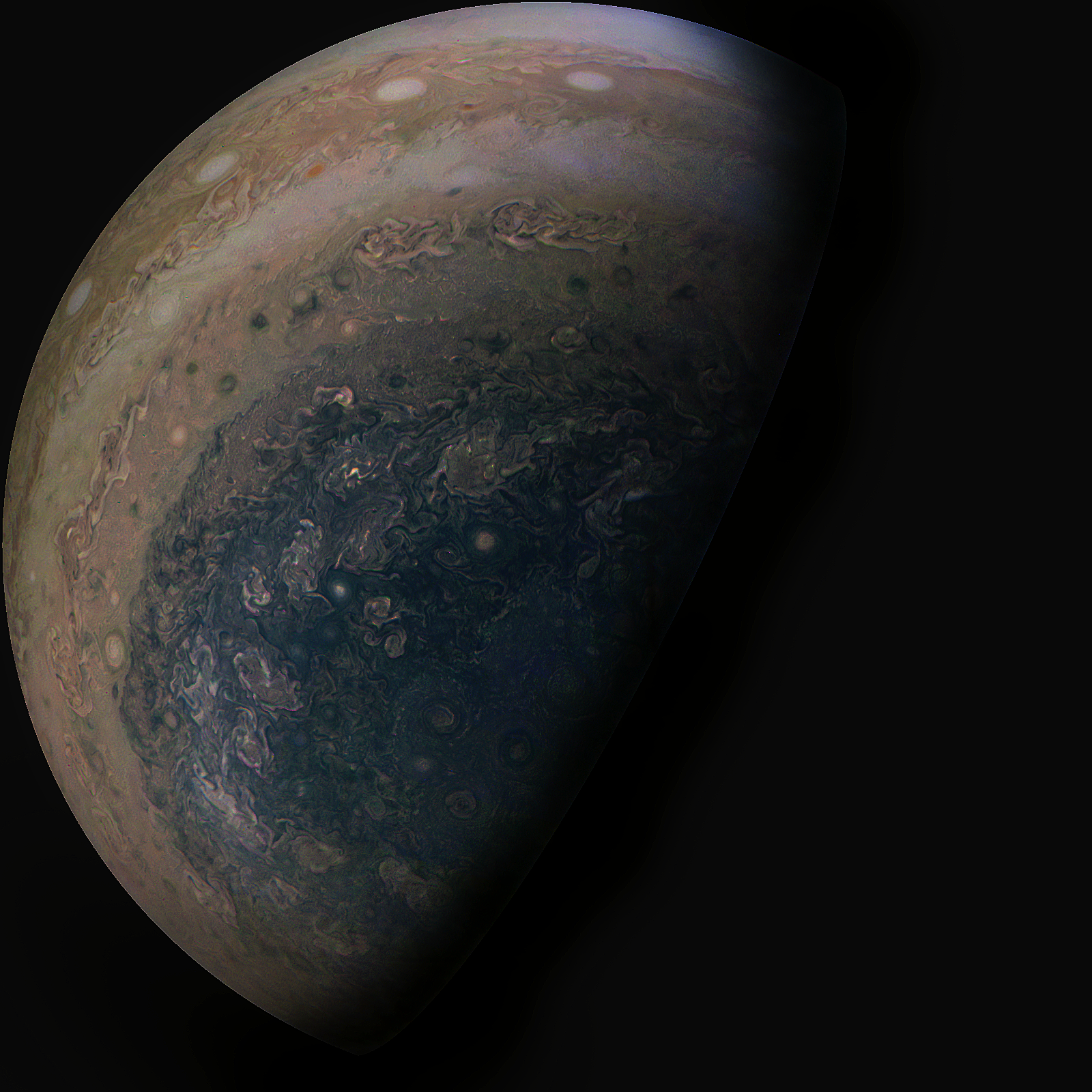 Jupiter's South pole image from the recent Juno mission, processed to reveal high level of detail on the planet's heavily cloudy surface.