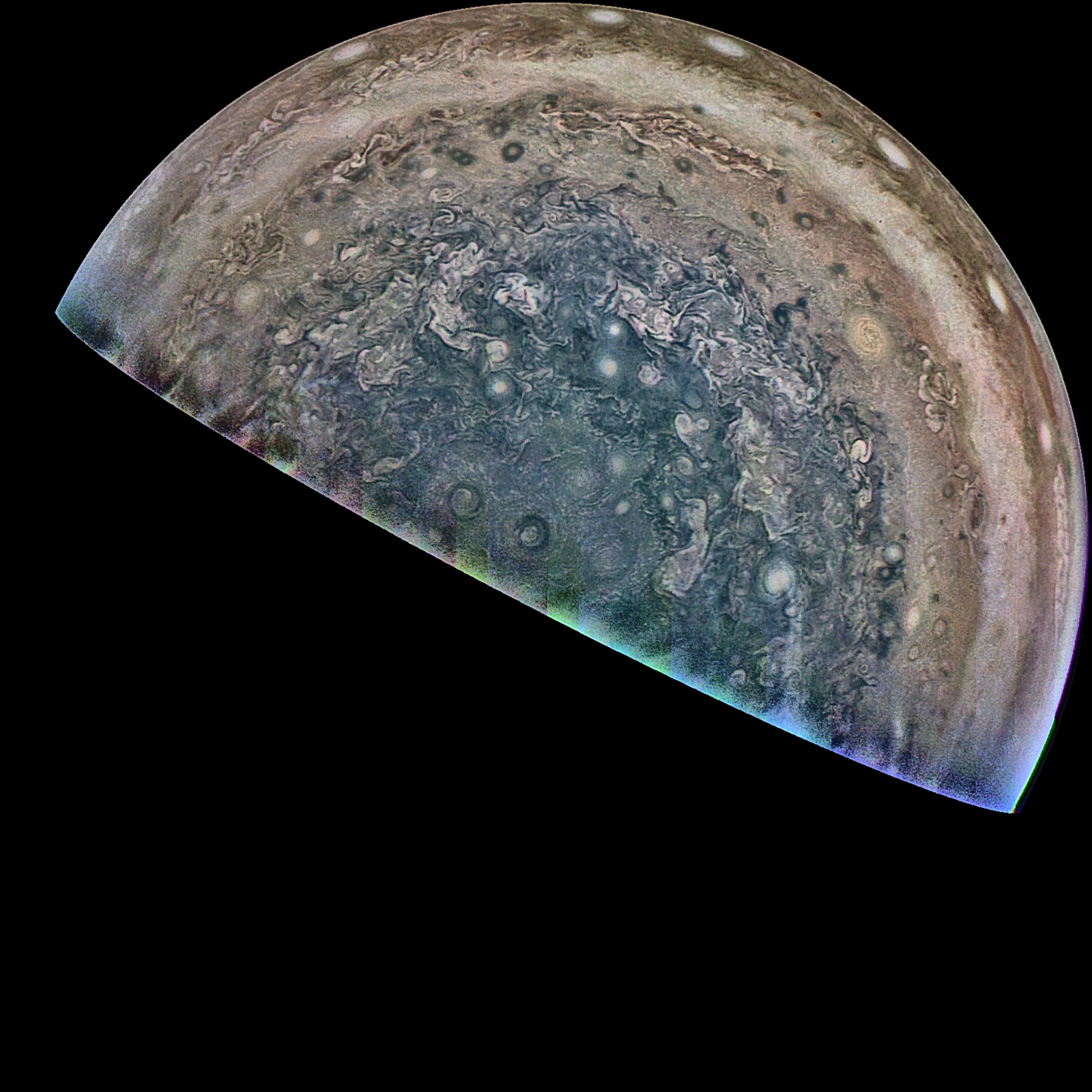 Junocam pixels are 12 bits deep from the camera but are converted to 8 bits inside the instrument using a lossless "companding" table, a process similar to gamma correction, to reduce their size. All Junocam products on the missionjuno website are in this 8-bit form as received on Earth. Scientific users interested in radiometric analysis should use the "RDR" data products archived with the Planetary Data System, which have been converted back to a linear 12-bit scale.