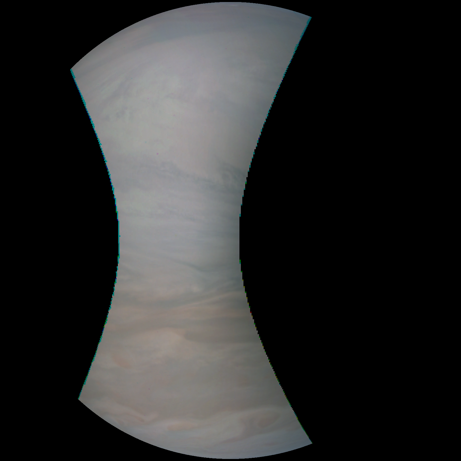 Junocam pixels are 12 bits deep from the camera but are converted to 8 bits inside the instrument using a lossless "companding" table, a process similar to gamma correction, to reduce their size. All Junocam products on the missionjuno website are in this 8-bit form as received on Earth. Scientific users interested in radiometric analysis should use the "RDR" data products archived with the Planetary Data System, which have been converted back to a linear 12-bit scale.