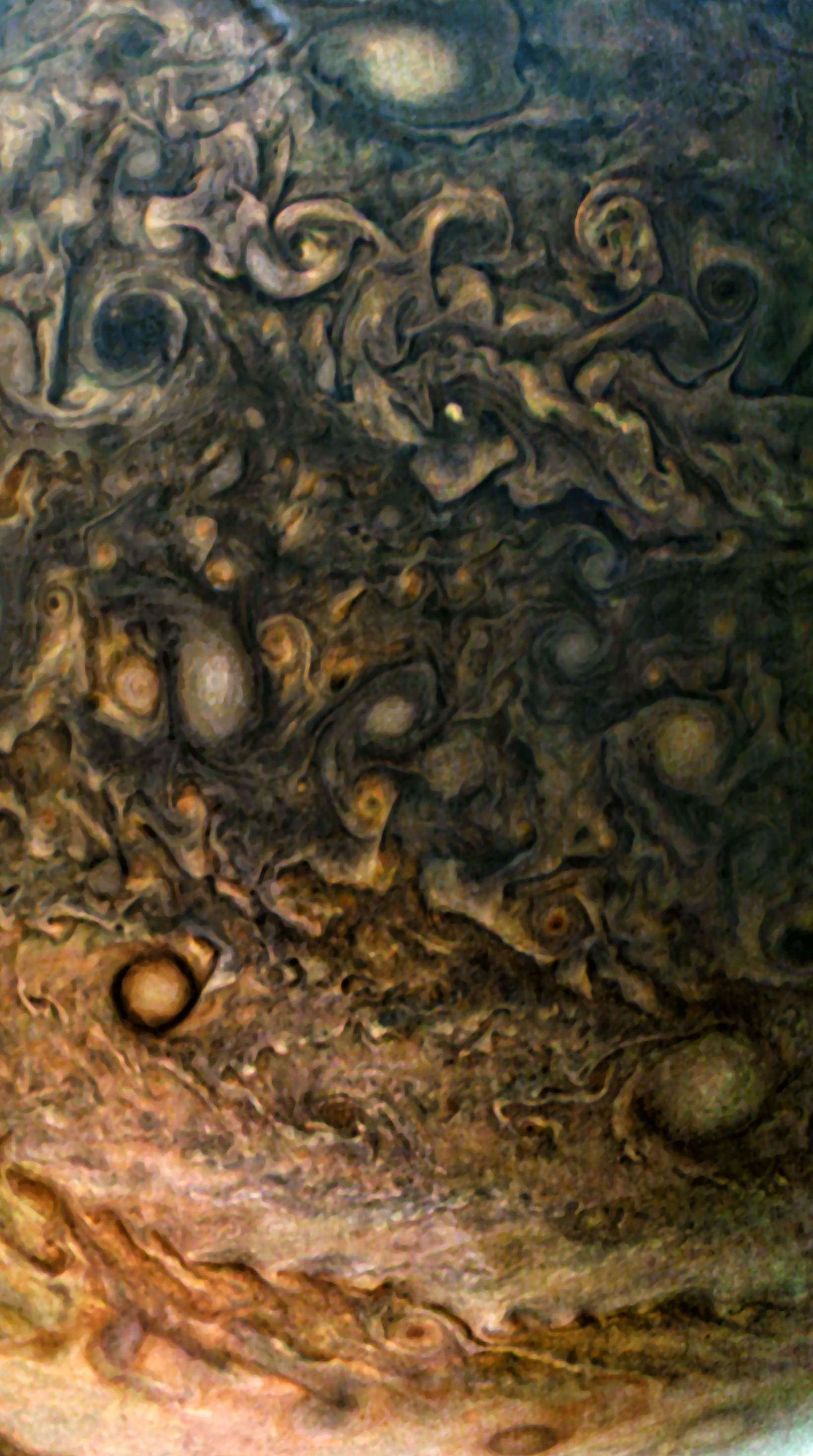 Junocam pixels are 12 bits deep from the camera but are converted to 8 bits inside the instrument using a lossless "companding" table, a process similar to gamma correction, to reduce their size. All Junocam products on the missionjuno website are in this 8-bit form as received on Earth. Scientific users interested in radiometric analysis should use the "RDR" data products archived with the Planetary Data System, which have been converted back to a linear 12-bit scale.