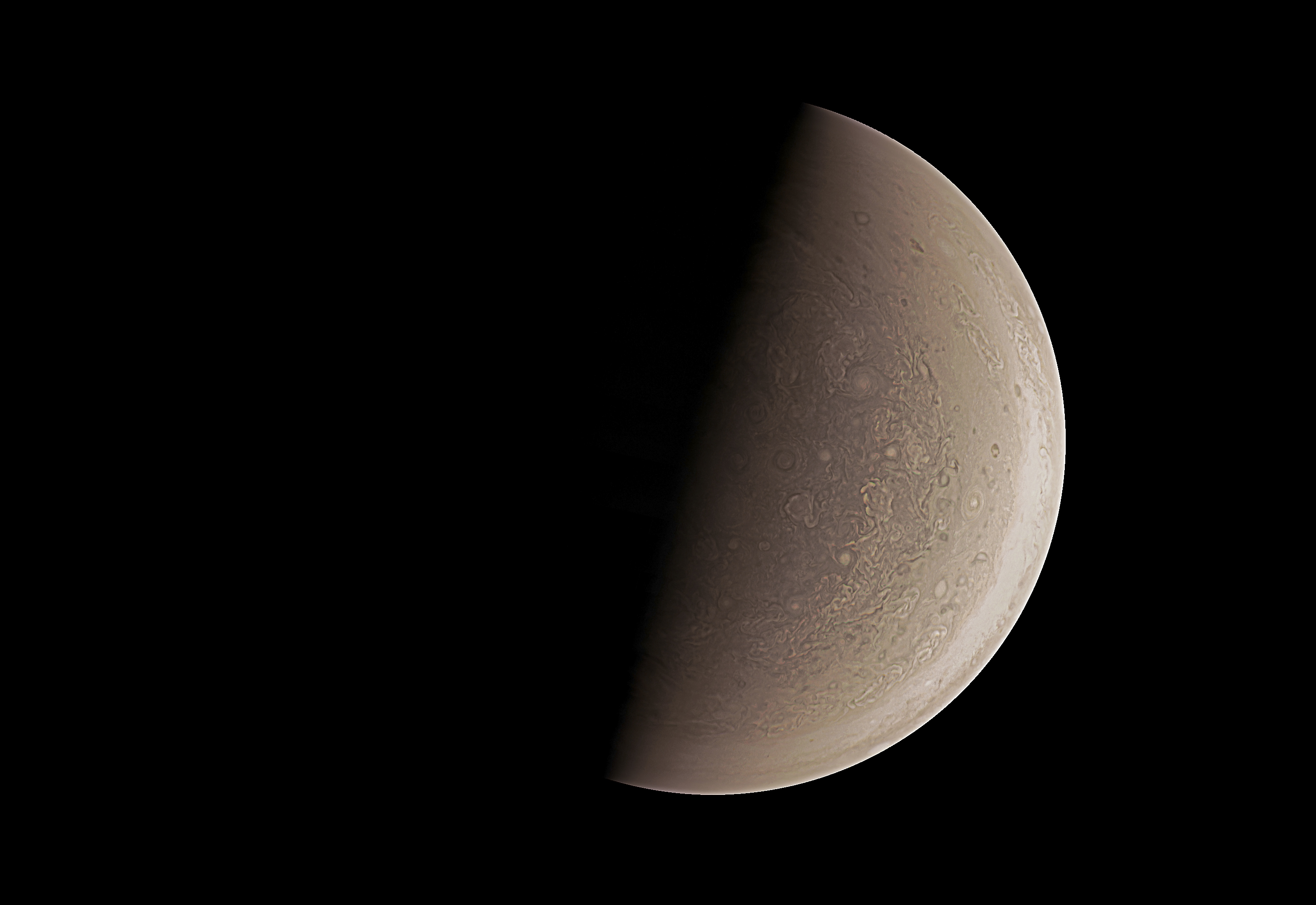Junocam pixels are 12 bits deep from the camera but are converted to 8 bits inside the instrument using a lossless "companding" table, a process similar to gamma correction, to reduce their size. All Junocam products on the missionjuno website are in this 8-bit form as received on Earth. Scientific users interested in radiometric analysis should use the "RDR" data products archived with the Planetary Data System, which have been converted back to a linear 12-bit scale.
