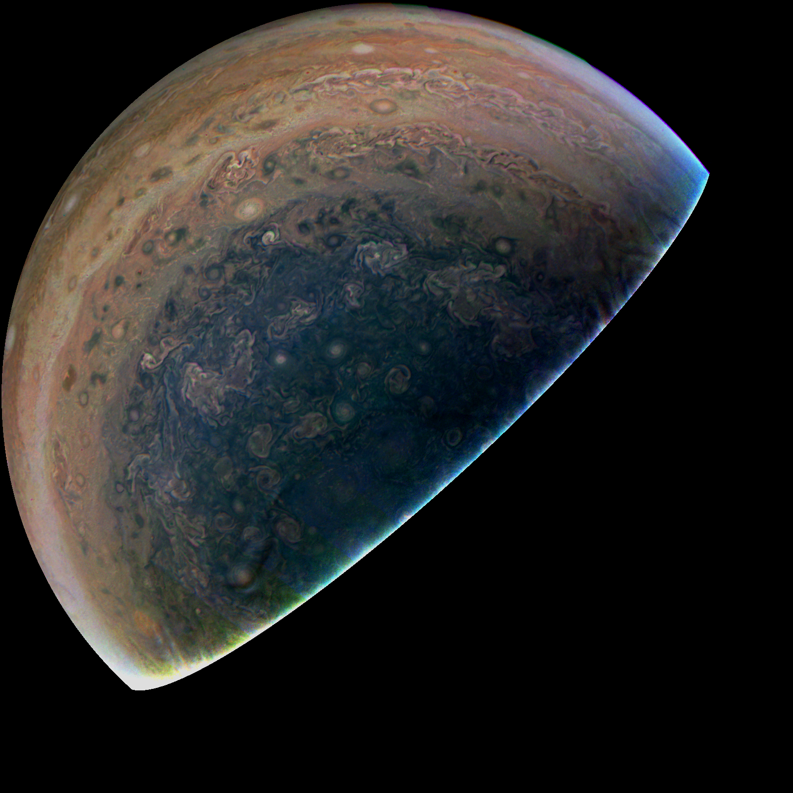 Junocam pixels are 12 bits deep from the camera but are converted to 8 bits inside the instrument using a lossless "companding" table, a process similar to gamma correction, to reduce their size. All Junocam products on the missionjuno website are in this 8-bit form as received on Earth. Scientific users interested in radiometric analysis should use the "RDR" data products archived with the Planetary Data System, which have been converted back to a linear 12-bit scale.