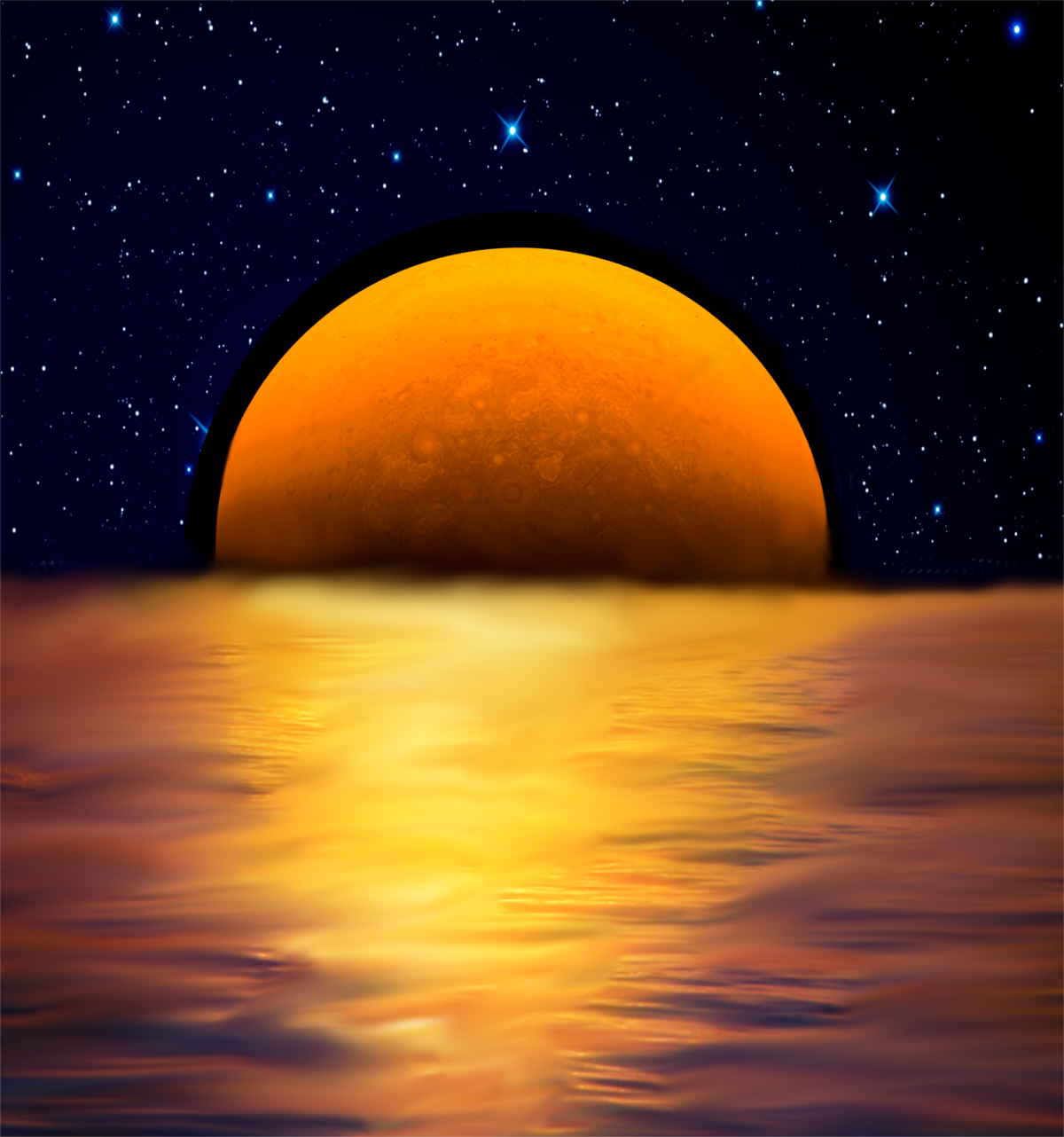 Jupiter 1 million years from now rising above the clouds of Europa. Strong tidal forces have increased the pressure inside Europa. Steam from the ocean below leaks into the now atmosphere. Europa's clouds are pure and reflective.
