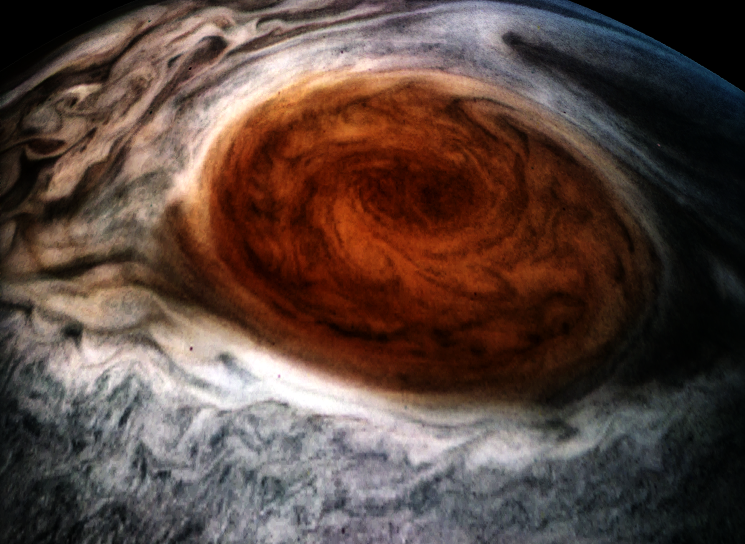 Junocam pixels are 12 bits deep from the camera but are converted to 8 bits inside the instrument using a lossless "companding" table, a process similar to gamma correction, to reduce their size. All Junocam products on the missionjuno website are in this 8-bit form as received on Earth. Scientific users interested in radiometric analysis should use the "RDR" data products archived with the Planetary Data System, which have been converted back to a linear 12-bit scale.