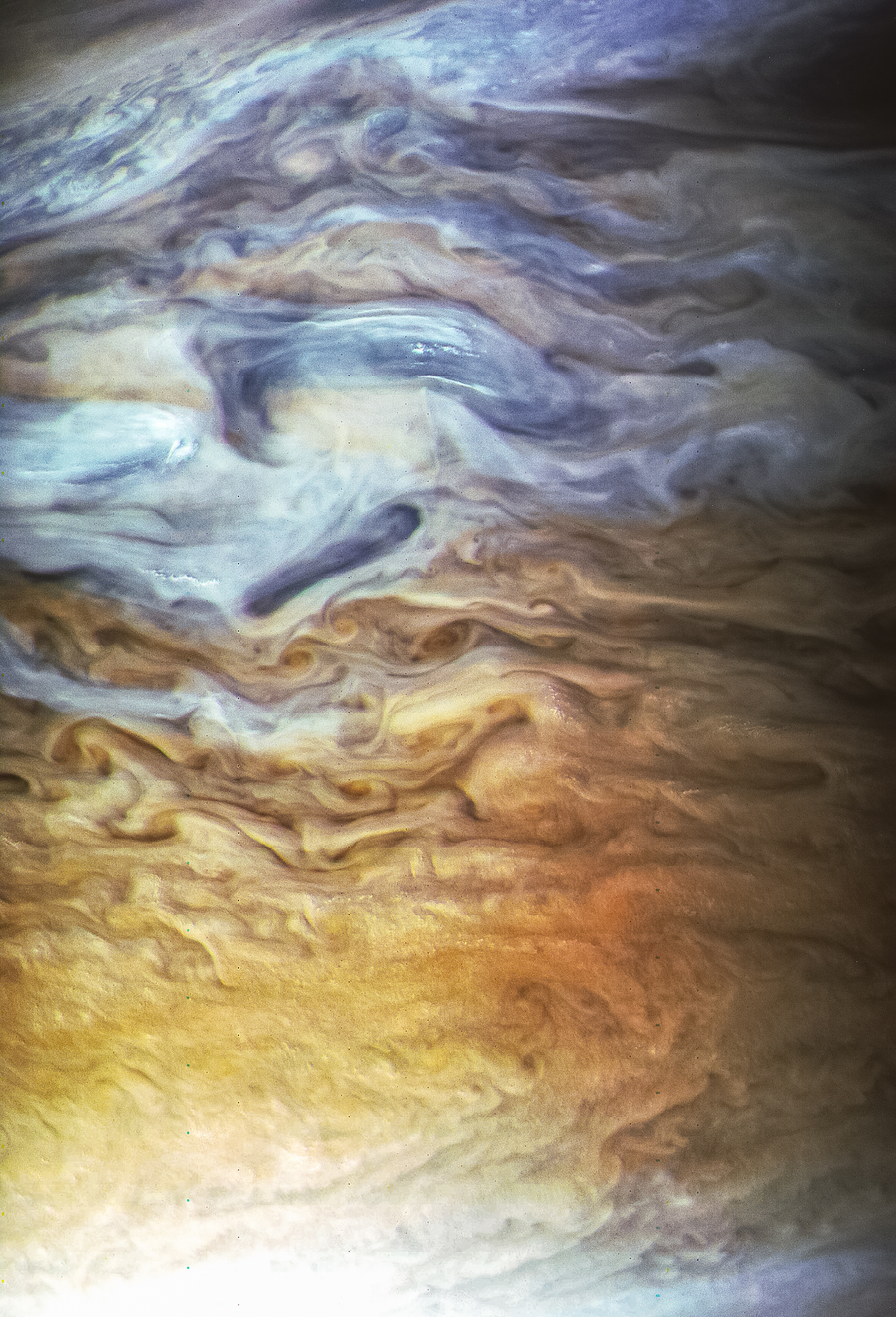 Junocam pixels are 12 bits deep from the camera but are converted to 8 bits inside the instrument using a lossless "companding" table, a process similar to gamma correction, to reduce their size. All Junocam products on the missionjuno website are in this 8-bit form as received on Earth. Scientific users interested in radiometric analysis should use the "RDR" data products archived with the Planetary Data System, which have been converted back to a linear 12-bit scale.