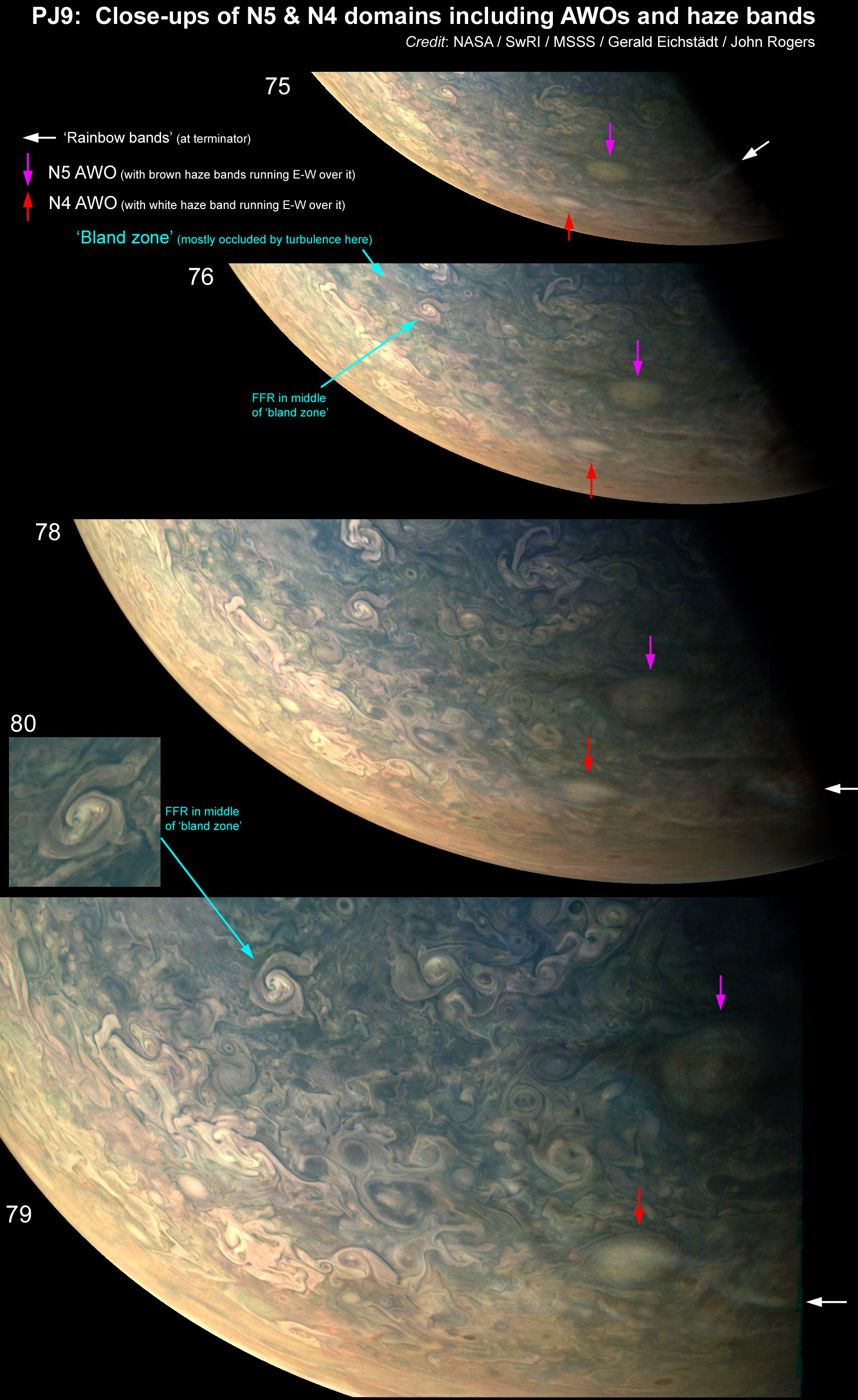 This set of images shows the tangle of anticyclonic ovals, cyclonic turbulent regions, and haze bands, in the N4 and N5 domains -- also covering a sector of the 'bland zone' (N6 domain) which is actually highly disturbed here. Both brown and white haze bands extend over the ovals. This is from a report on the PJ9 images, posted on the BAA Jupiter Section web site at: https://britastro.org/node/11780