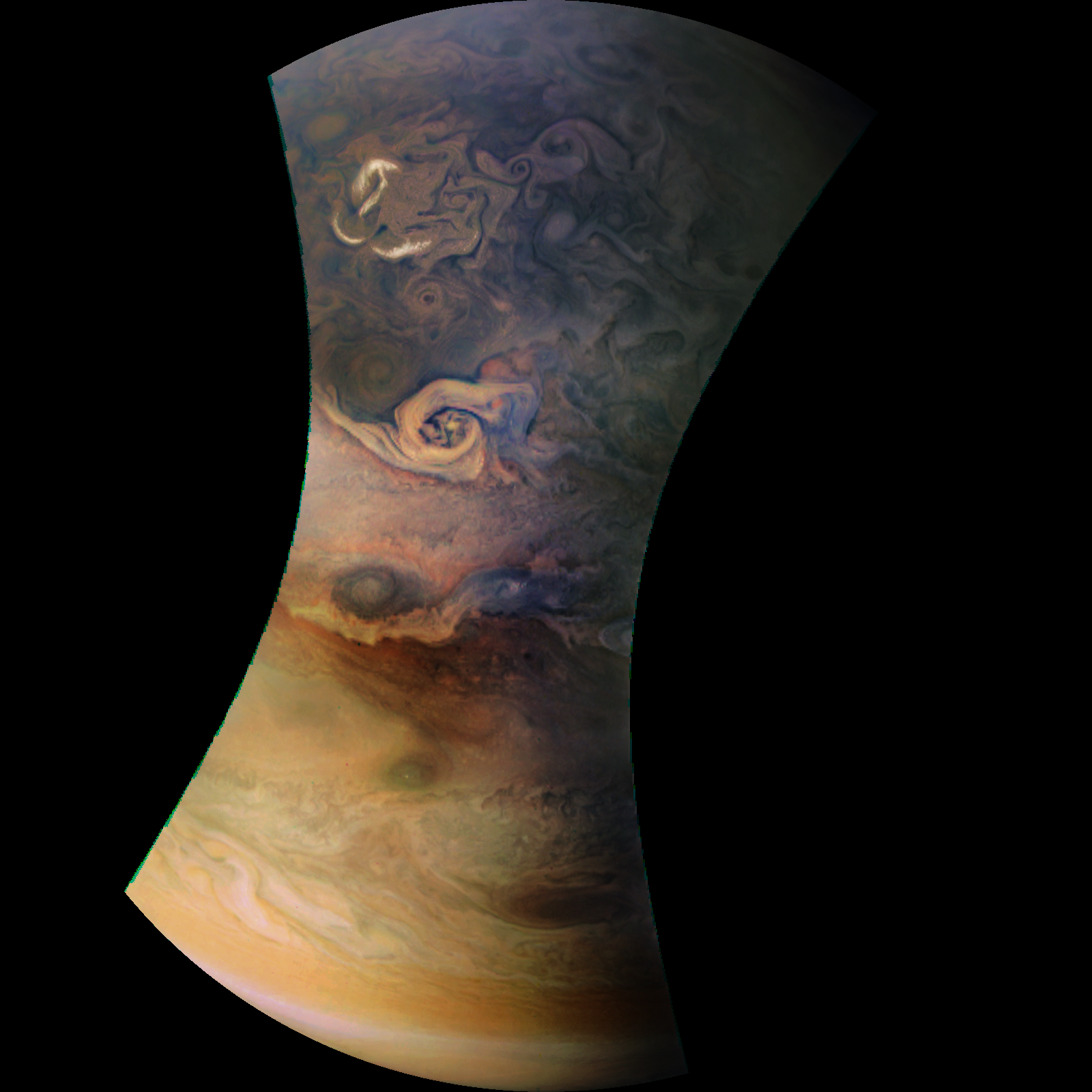 Junocam pixels are 12 bits deep from the camera but are converted to 8 bits inside the instrument using a lossless "companding" table, a process similar to gamma correction, to reduce their size. All Junocam products on the missionjuno website are in this 8-bit form as received on Earth. Scientific users interested in radiometric analysis should use the "RDR" data products archived with the Planetary Data System, which have been converted back to a linear 12-bit scale.