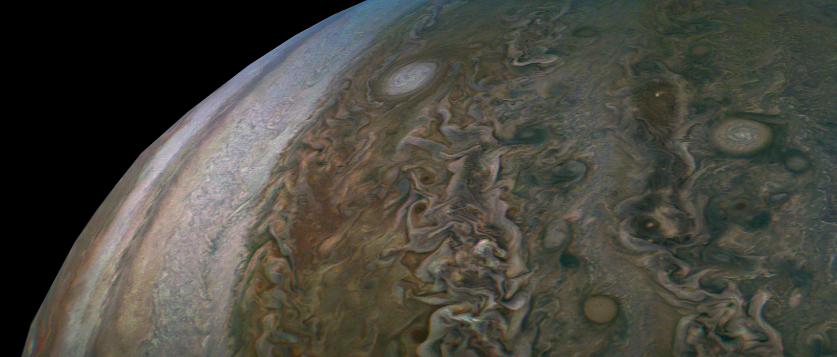 Junocam pixels are 12 bits deep from the camera but are converted to 8 bits inside the instrument using a lossless "companding" table, a process similar to gamma correction, to reduce their size. All Junocam products on the missionjuno website are in this 8-bit form as received on Earth. Scientific users interested in radiometric analysis should use the "RDR" data products archived with the Planetary Data System, which have been converted back to a linear 12-bit scale.