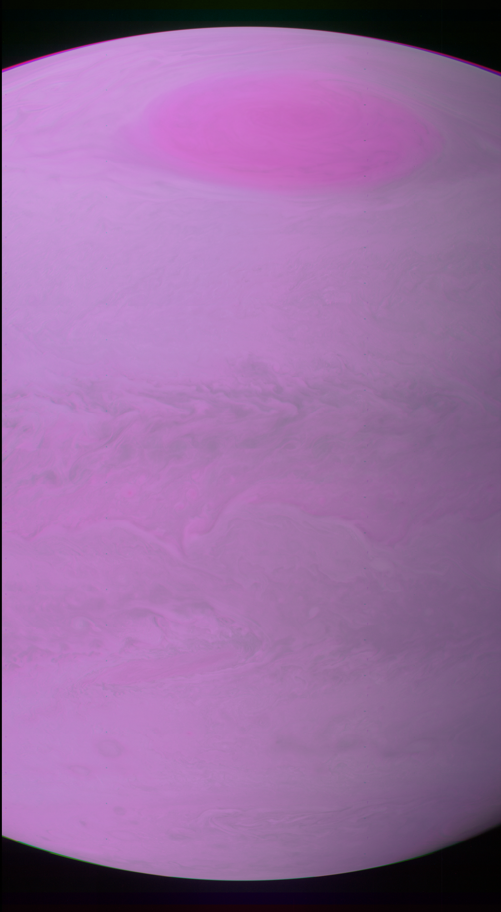 Junocam pixels are 12 bits deep from the camera but are converted to 8 bits inside the instrument using a lossless "companding" table, a process similar to gamma correction, to reduce their size. All Junocam products on the missionjuno website are in this 8-bit form as received on Earth. Scientific users interested in radiometric analysis should use the "RDR" data products archived with the Planetary Data System, which have been converted back to a linear 12-bit scale.