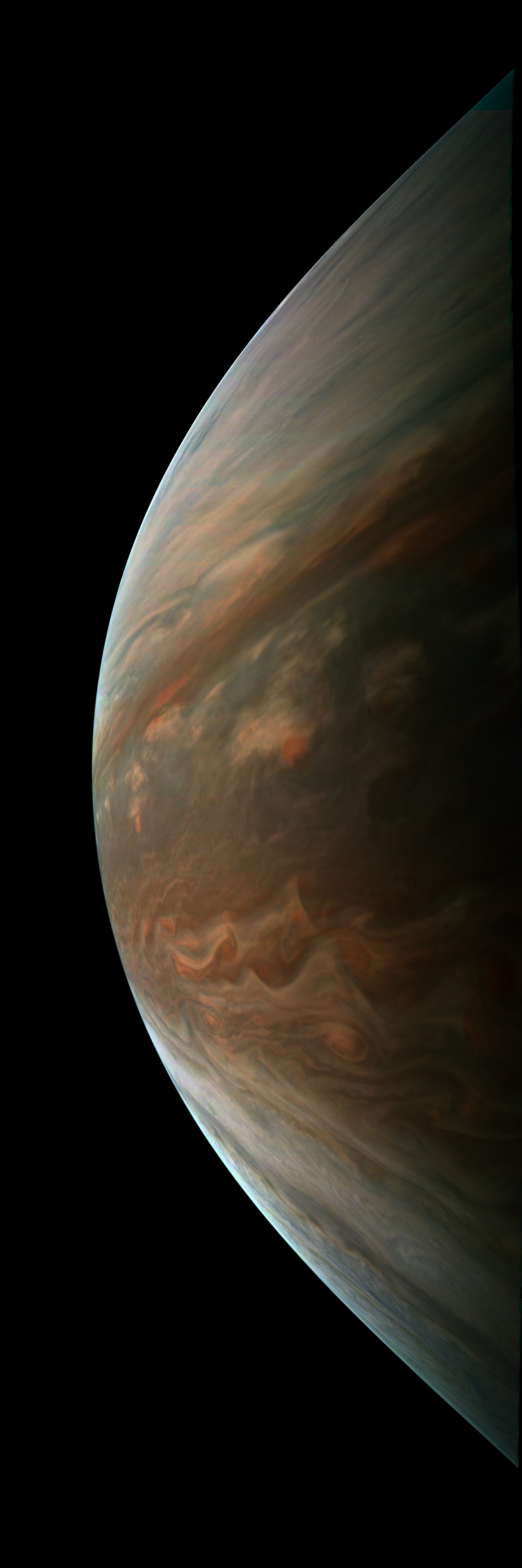 This image has been taken during Juno's Perijove-10 Jupiter flyby. It is rendered directly from the raw in one monolithitic step, except file format conversions.