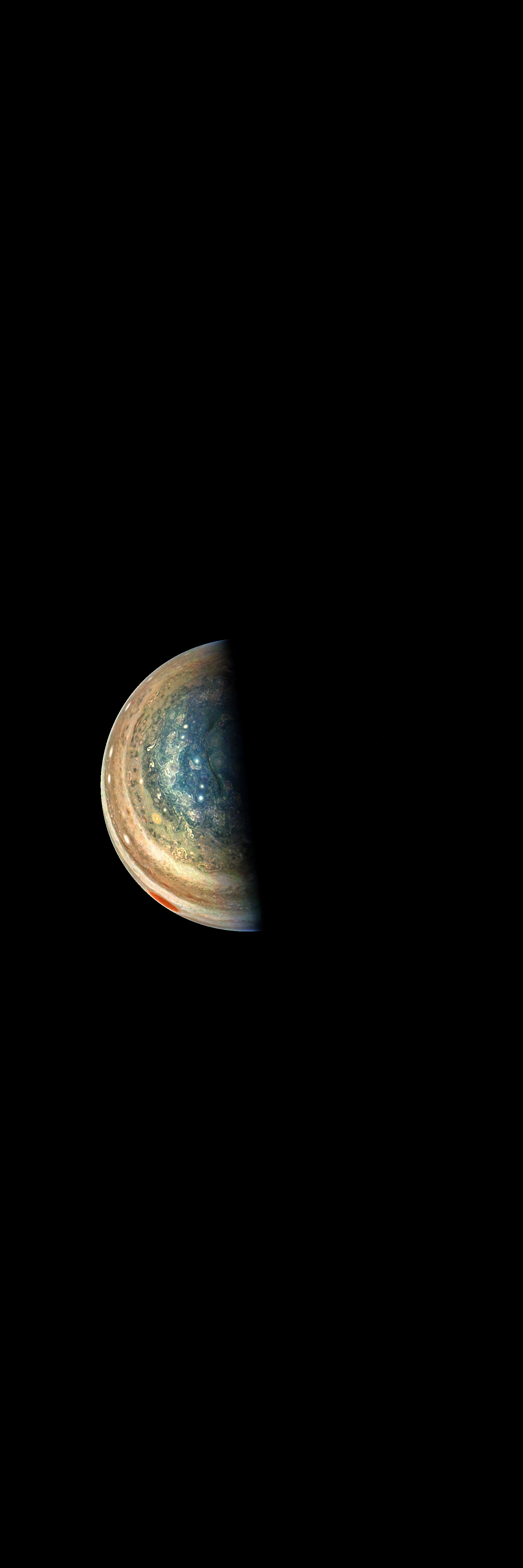 This image has been taken during Juno's Perijove-10 Jupiter flyby. It is rendered directly from the raw in one monolithitic step, except file format conversions.