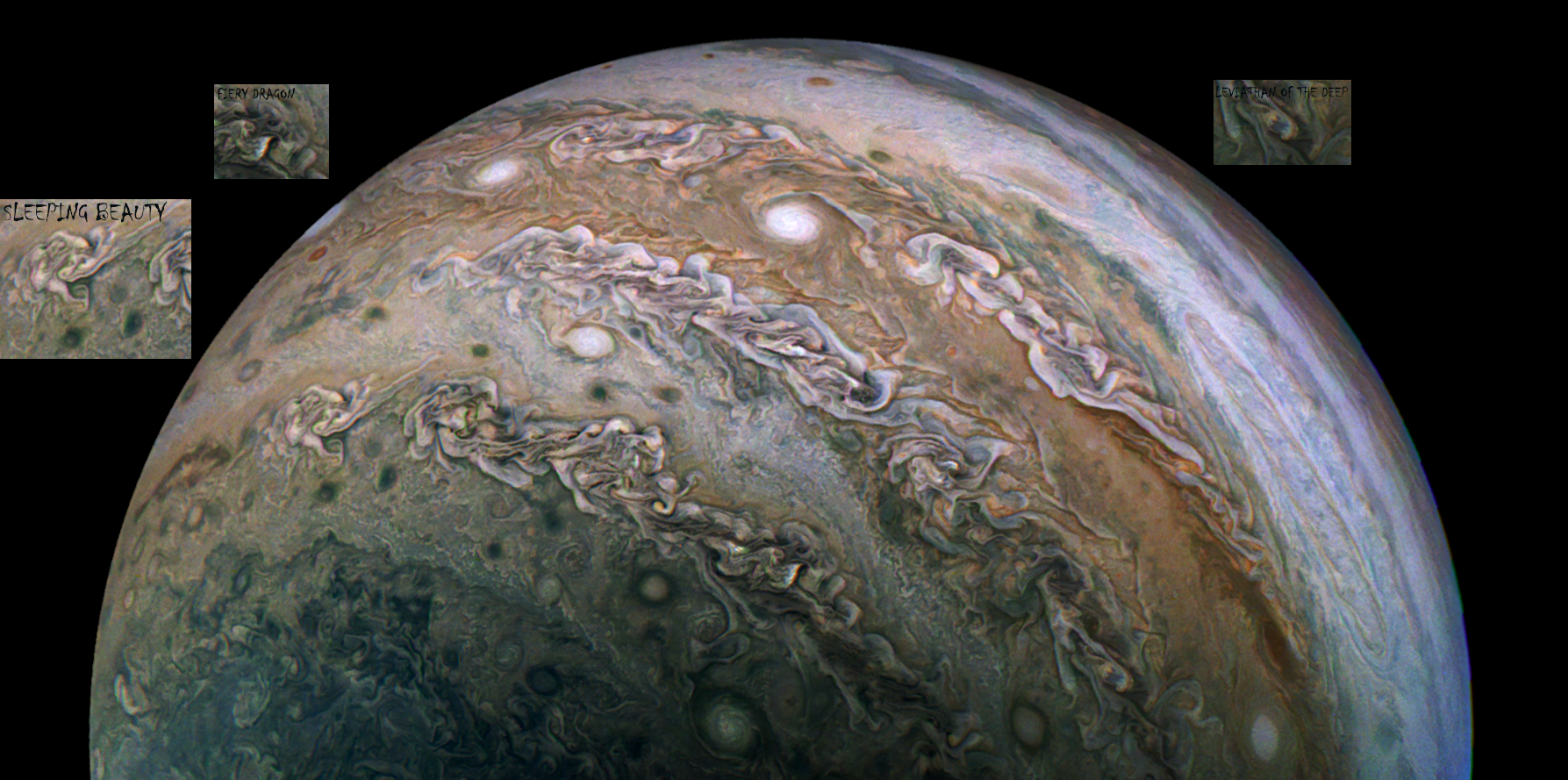 Enhanced RGB of Jupiter at Perijove10. My own take on points of interest. I understand how ancient civilizations had to explain what they saw. How would they interpret Jupiter at close quarters?