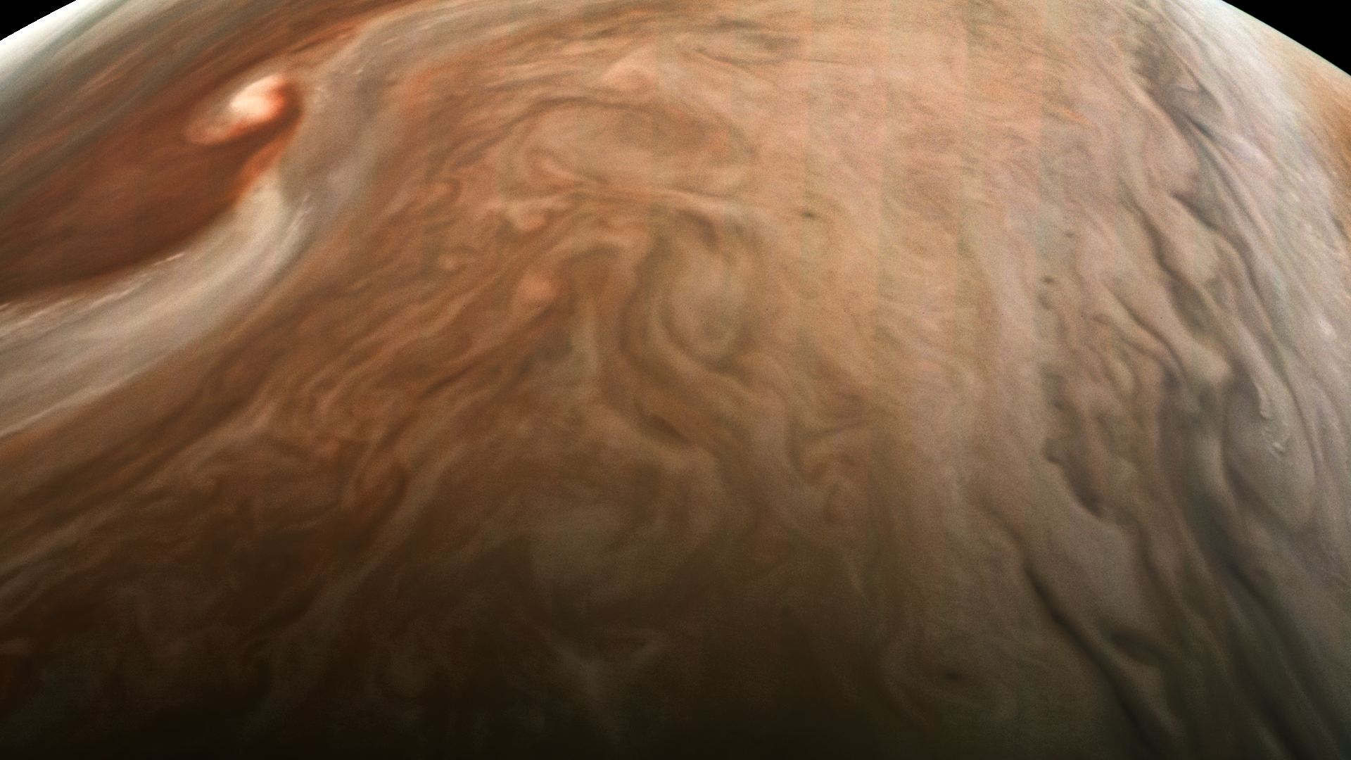 The raw image has been Huffman encoded by JunoCam, hence it doesn't show DCT compression artifacts, which would have removed or ambiguated most of these features.
