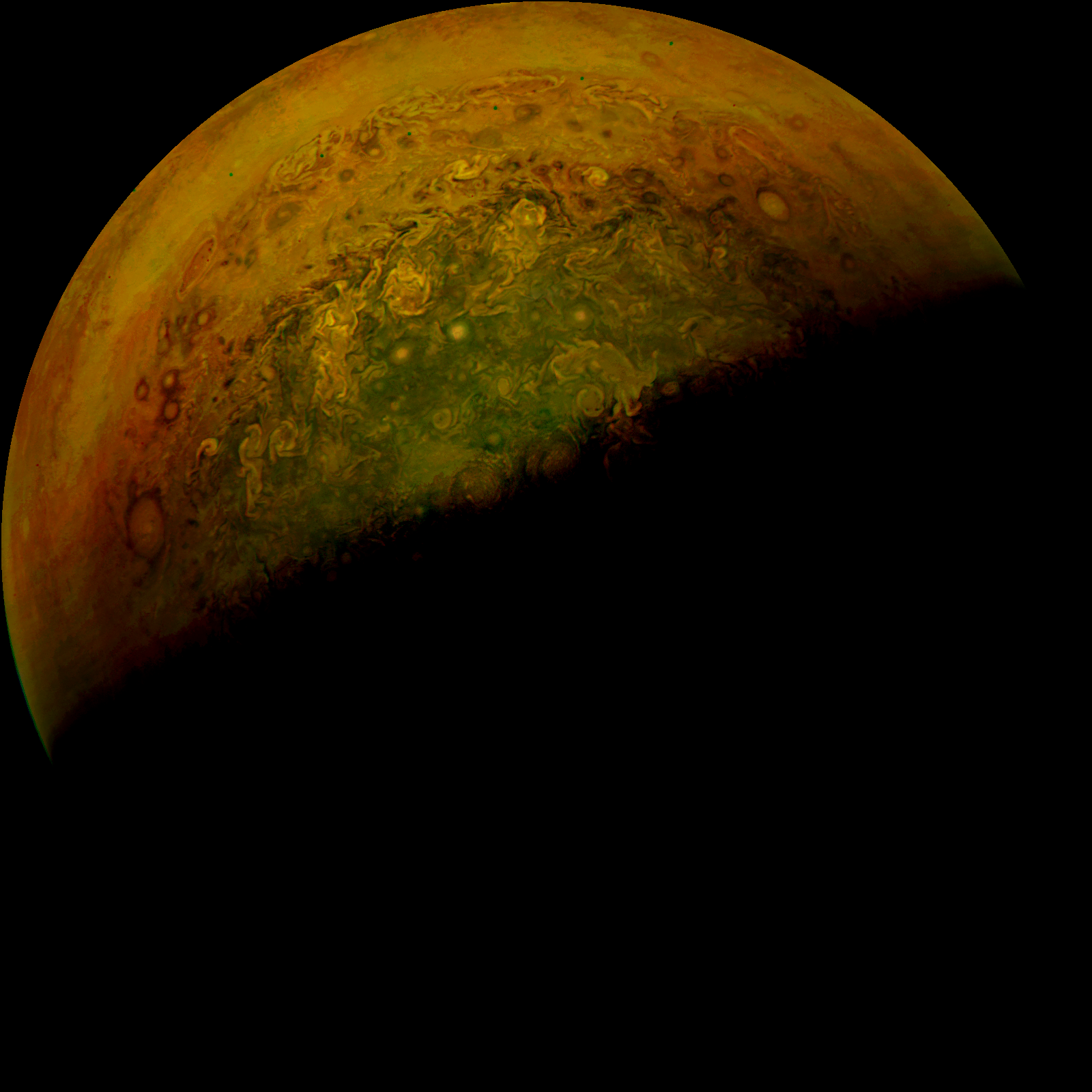 Junocam pixels are 12 bits deep from the camera but are converted to 8 bits inside the instrument using a lossless "companding" table, a process similar to gamma correction, to reduce their size. All Junocam products on the missionjuno website are in this 8-bit form as received on Earth. Scientific users interested in radiometric analysis should use the "RDR" data products archived with the Planetary Data System, which have been converted back to a linear 12-bit scale.