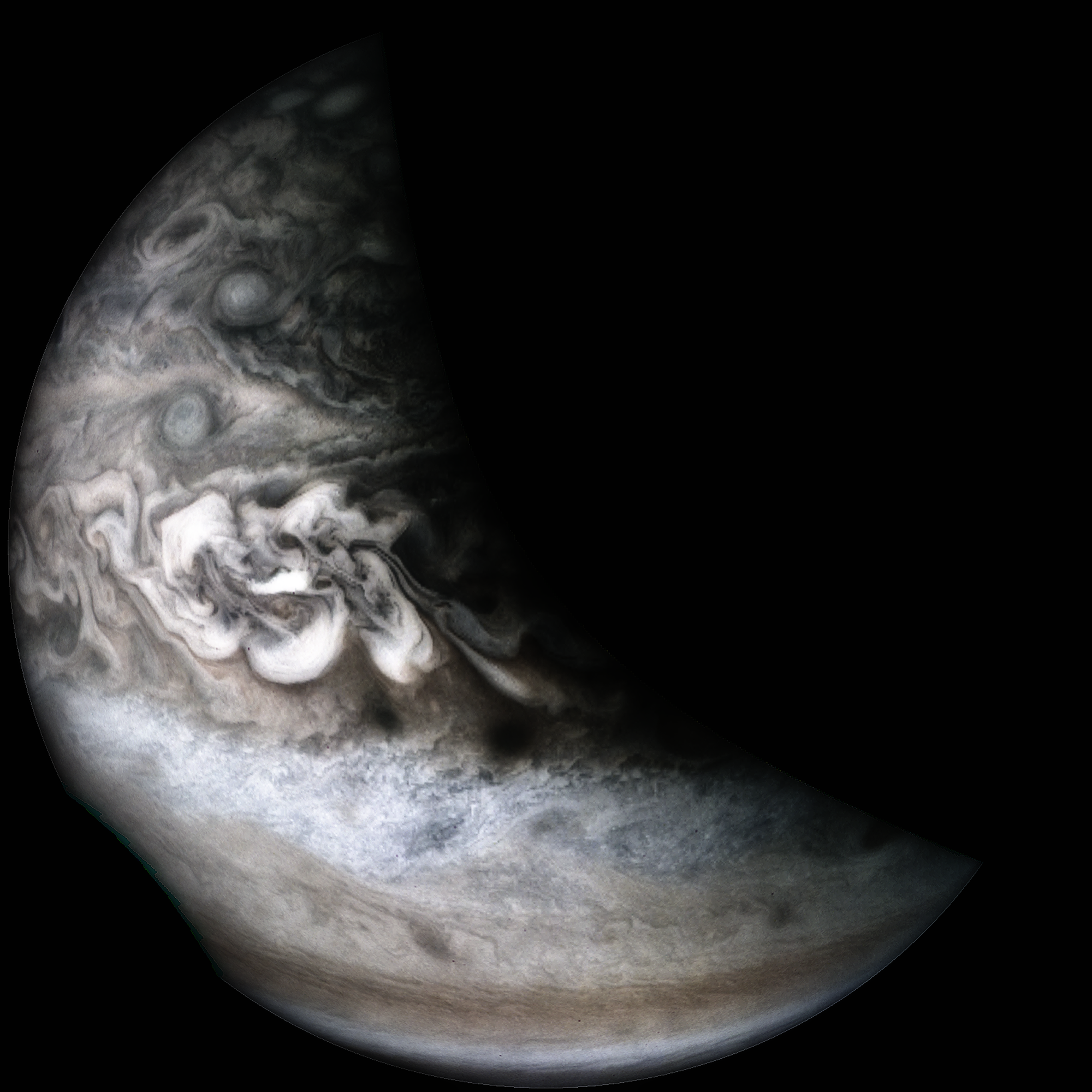 Junocam pixels are 12 bits deep from the camera but are converted to 8 bits inside the instrument using a lossless "companding" table, a process similar to gamma correction, to reduce their size. All Junocam products on the missionjuno website are in this 8-bit form as received on Earth. Scientific users interested in radiometric analysis should use the "RDR" data products archived with the Planetary Data System, which have been converted back to a linear 12-bit scale.