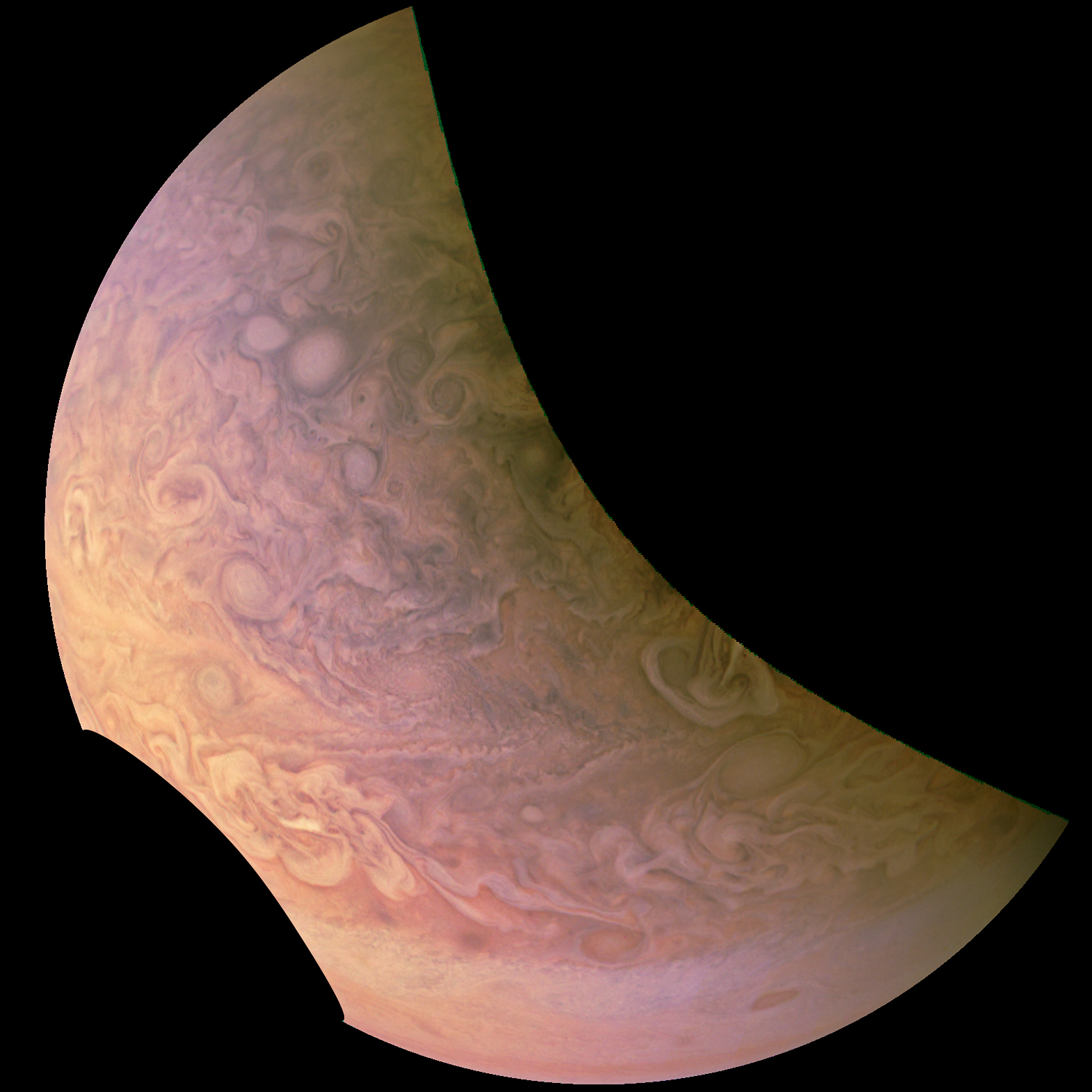 Junocam pixels are 12 bits deep from the camera but are converted to 8 bits inside the instrument using a lossless "companding" table, a process similar to gamma correction, to reduce their size. All Junocam products on the missionjuno website are in this 8-bit form as received on Earth. Scientific users interested in radiometric analysis should use the "RDR" data products archived with the Planetary Data System, which have been converted back to a linear 12-bit scale.