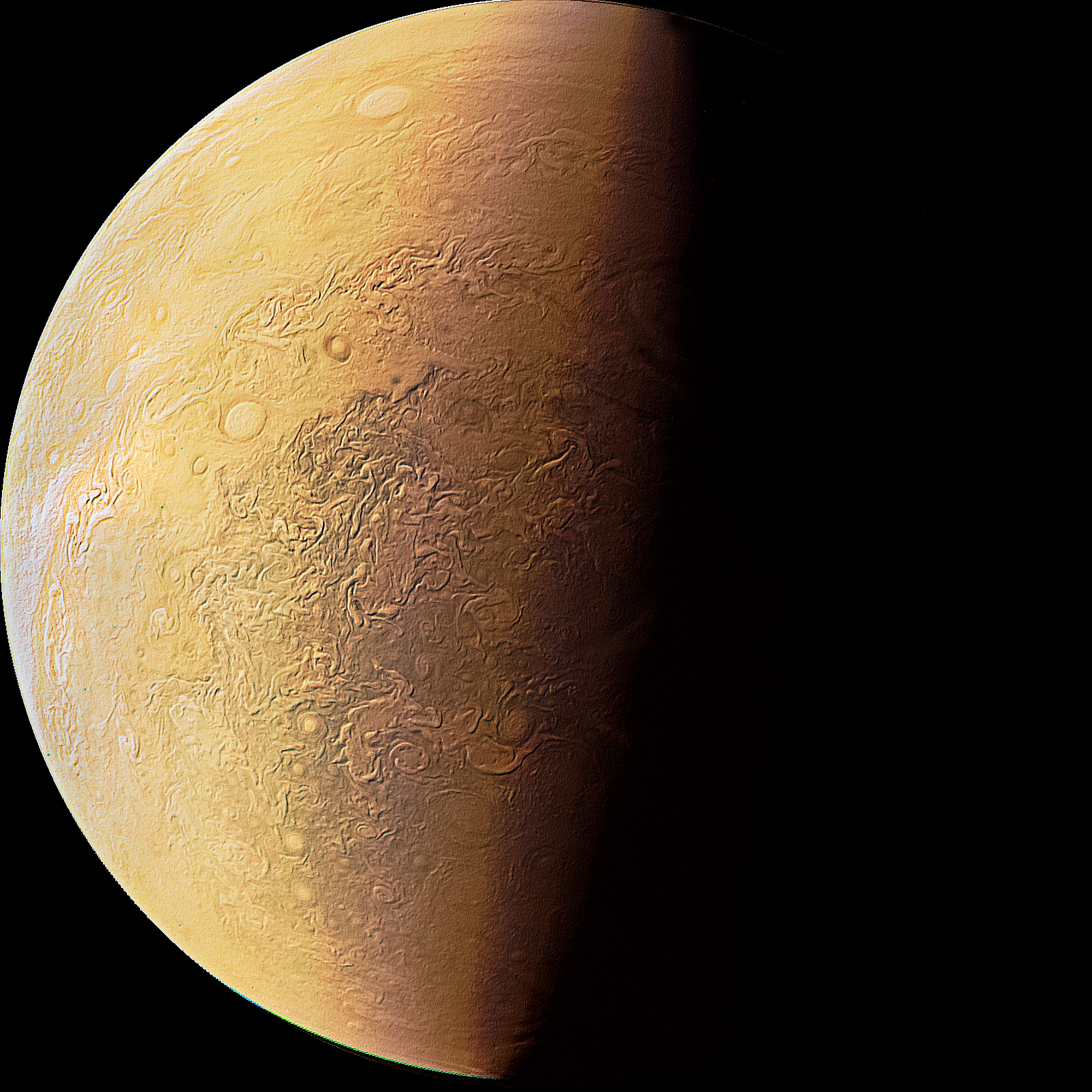 Junocam pixels are 12 bits deep from the camera but are converted to 8 bits inside the instrument using a lossless "companding" table, a process similar to gamma correction, to reduce their size. All Junocam products on the missionjuno website are in this 8-bit form as received on Earth. Scientific users interested in radiometric analysis should use the "RDR" data products archived with the Planetary Data System, which have been converted back to a linear 12-bit scale.