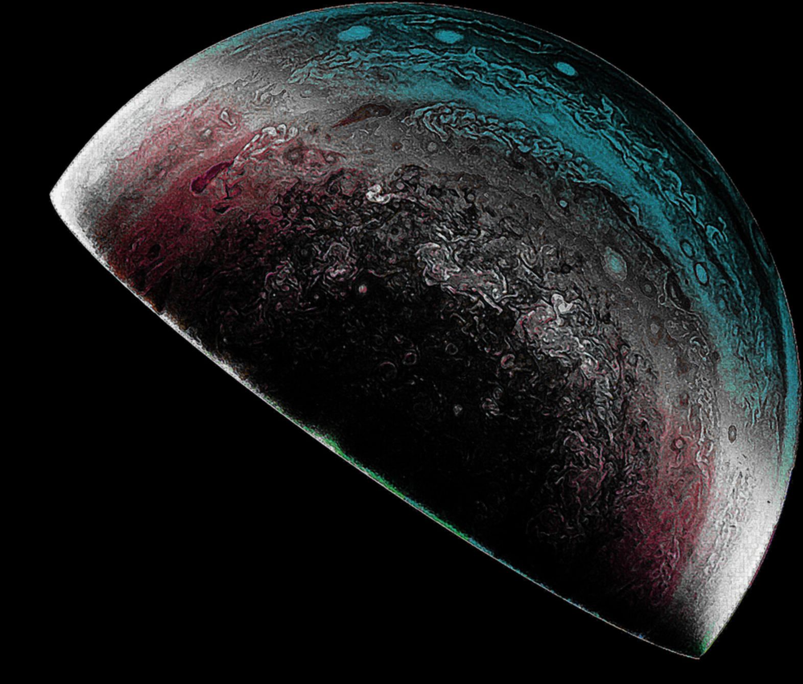 Junocam pixels are 12 bits deep from the camera but are converted to 8 bits inside the instrument using a lossless "companding" table, a process similar to gamma correction, to reduce their size. All Junocam products on the missionjuno website are in this 8-bit form as received on Earth. Scientific users interested in radiometric analysis should use the "RDR" data products archived with the Planetary Data System, which have been converted back to a linear 12-bit scale.