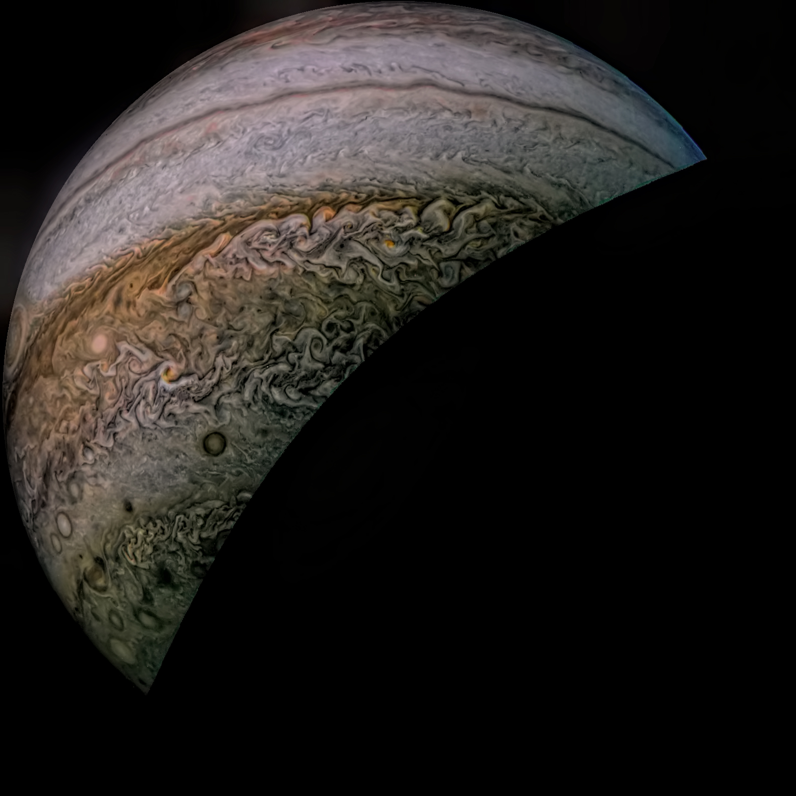 Junocam pixels are 12 bits deep from the camera but are converted to 8 bits inside the instrument using a lossless "companding" table, a process similar to gamma correction, to reduce their size. All Junocam products on the missionjuno website are in this 8-bit form as received on Earth. Scientific users interested in radiometric analysis should use the "RDR" data products archived with the Planetary Data System, which have been converted back to a linear 12-bit scale.