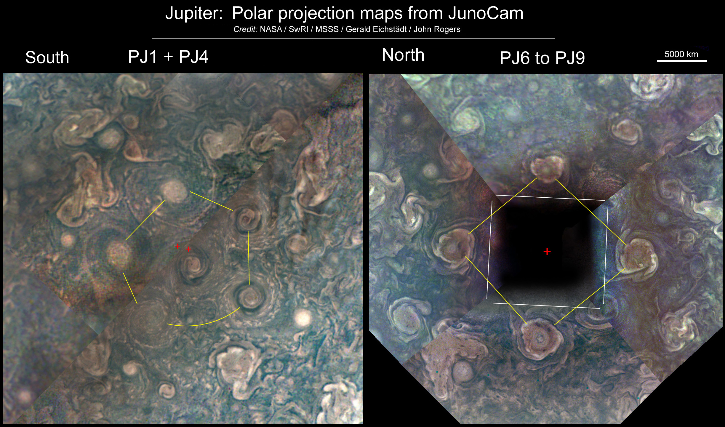 A paper published today, from the JunoCam and JIRAM teams, shows that the clusters of cyclones at Jupiter's poles are actually stable polygons: a pentagon in the south and a modified octagon in the north. Here are composites of the two poles from multiple perijoves. A detailed report on the JunoCam results has been posted at https://britastro.org/node/12654; the PDF and the illustrations from it are also on the new Think Tank page on this JunoCam web site, under 'Circumpolar cyclones (CPCs)'.
