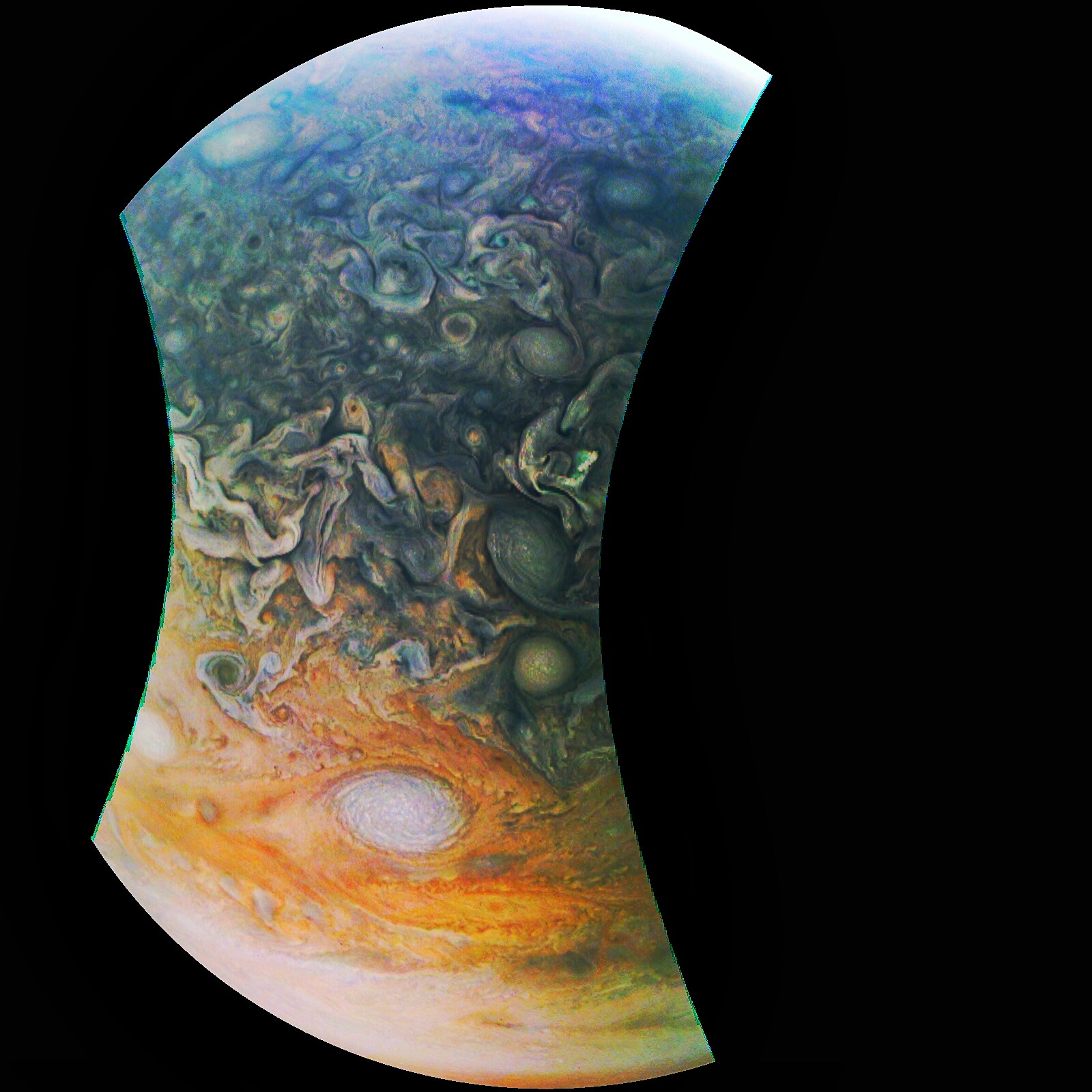 Junocam pixels are 12 bits deep from the camera but are converted to 8 bits inside the instrument using a lossless "companding" table, a process similar to gamma correction, to reduce their size. All Junocam products on the missionjuno website are in this 8-bit form as received on Earth. Scientific users interested in radiometric analysis should use the "RDR" data products archived with the Planetary Data System, which have been converted back to a linear 12-bit scale.