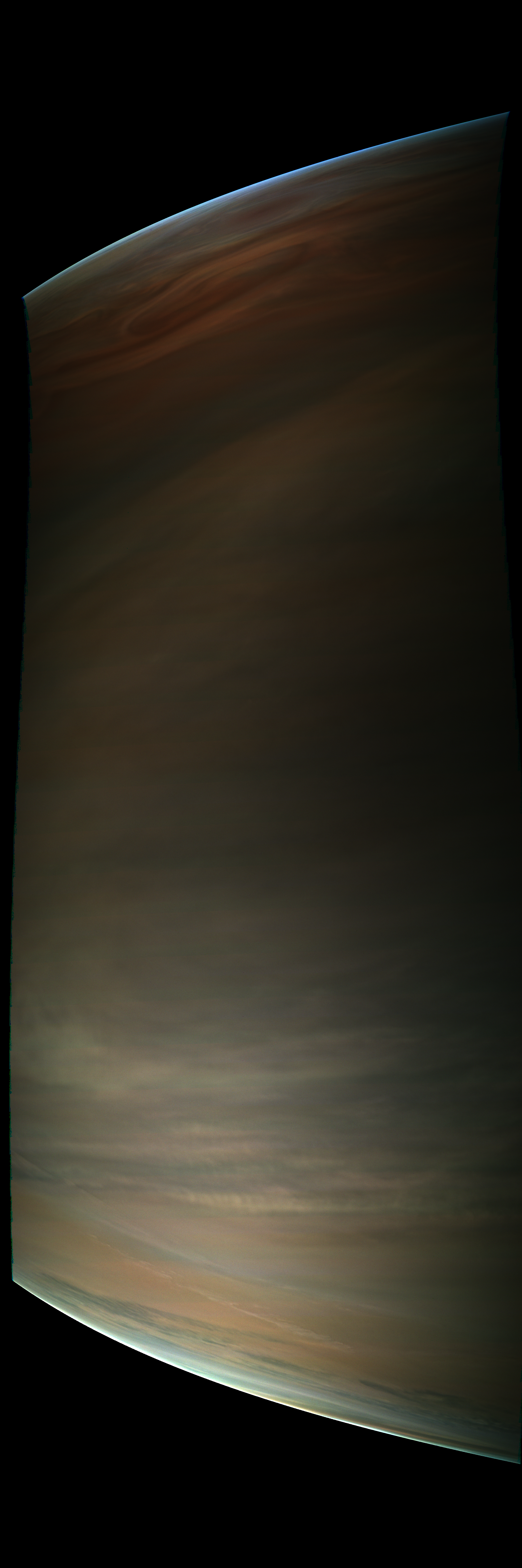 The raw has been decompanded, approximately radiometrically corrected, reprojected to a cylindrical FOV of 60x180 degrees using SPICE kernels and a Jupiter spheroid model, illumination-adjusted by a slightly modified best-fit illumination model derived from PJ6 images, gamma-stretched with gamma=4 relative to radiometric data, and mostly patched from repetitive camera artifacts.
