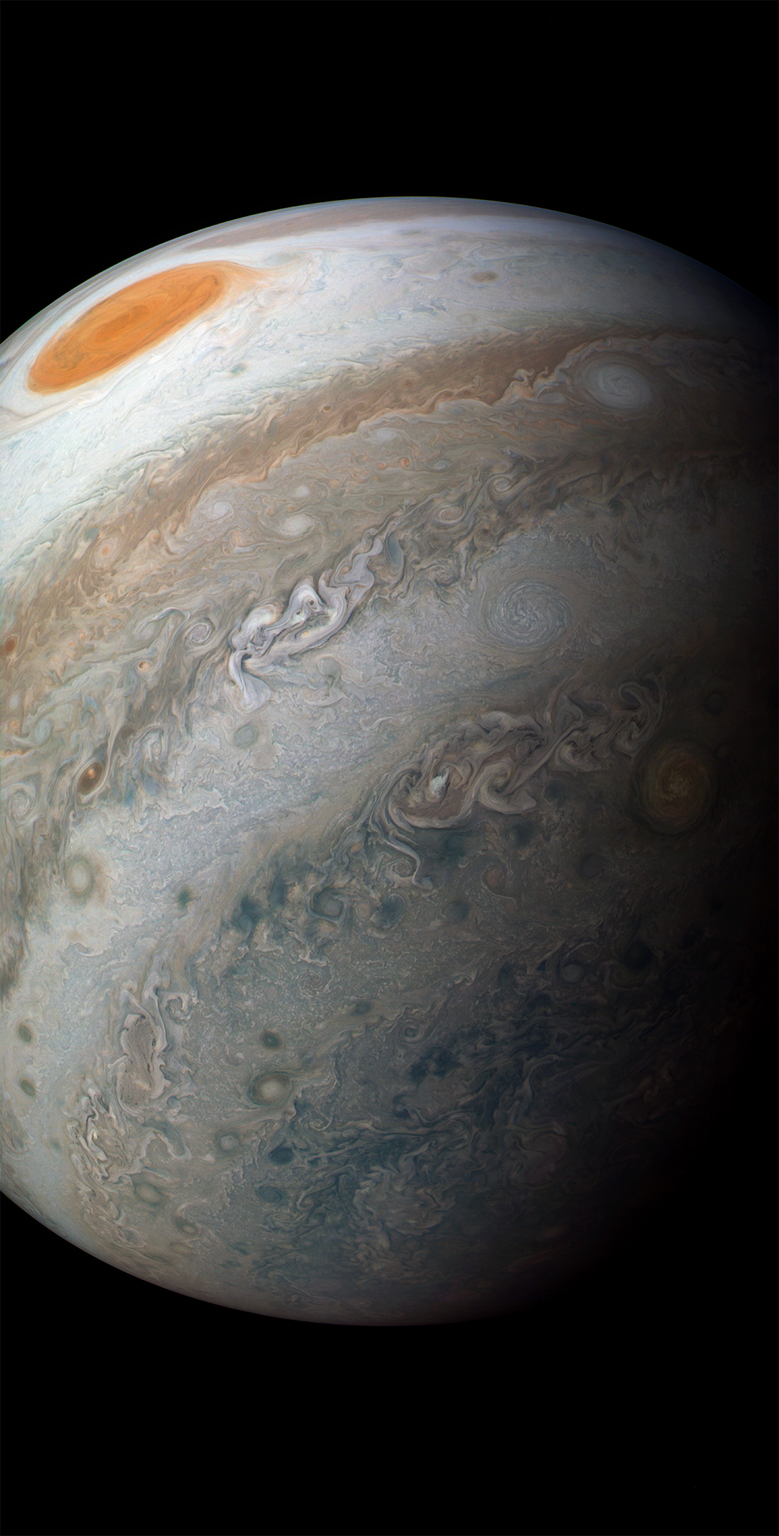 Junocam pixels are 12 bits deep from the camera but are converted to 8 bits inside the instrument using a lossless "companding" table, a process similar to gamma correction, to reduce their size. All Junocam products on the missionjuno website are in this 8-bit form as received on Earth. Scientific users interested in radiometric analysis should use the "RDR" data products archived with the Planetary Data System, which have been converted back to a linear 12-bit scale.