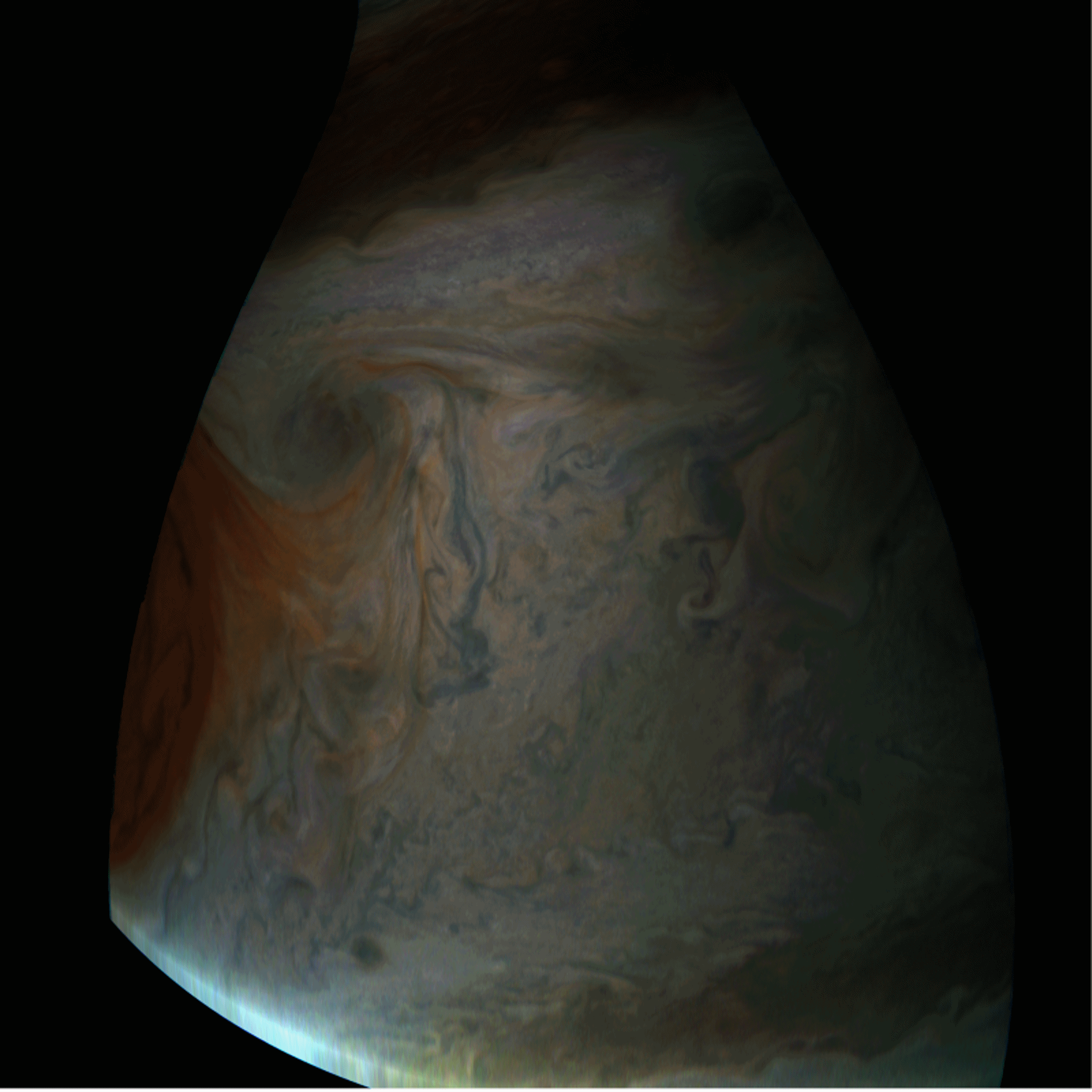 Junocam pixels are 12 bits deep from the camera but are converted to 8 bits inside the instrument using a lossless "companding" table, a process similar to gamma correction, to reduce their size. All Junocam products on the missionjuno website are in this 8-bit form as received on Earth. Scientific users interested in radiometric analysis should use the "RDR" data products archived with the Planetary Data System, which have been converted back to a linear 12-bit scale.