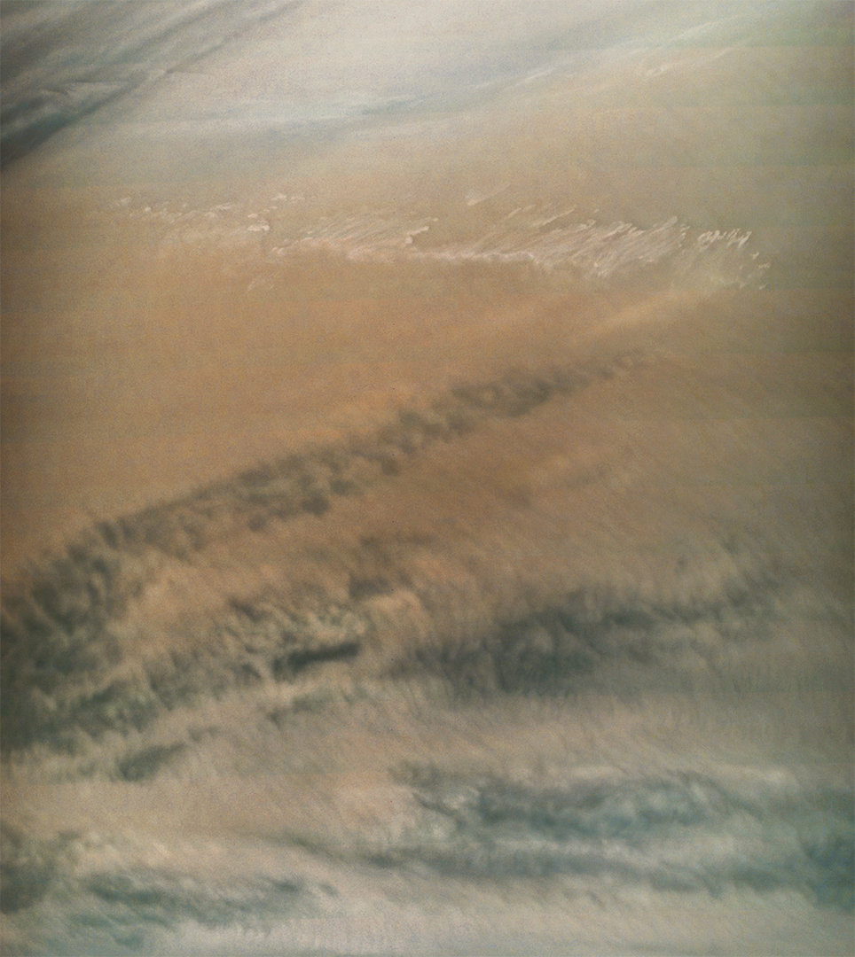 We have a methane filter, included for the polar science investigation, that is almost at the limits of our detector’s wavelength range. To get enough photons for an image we need to use a very long exposure. In some images this results in scattered light in the image. For science purposes we will simply crop out the portions of the image that include this artifact. Work is in progress to determine exactly what conditions cause stray light problems so that this can be minimized for future imaging.