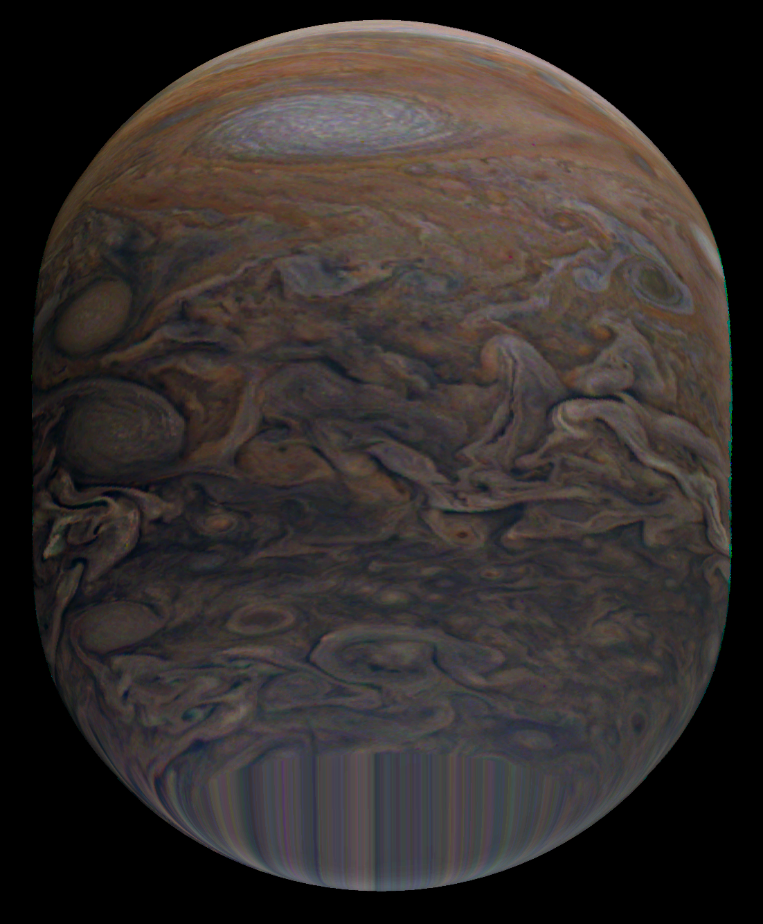 Junocam pixels are 12 bits deep from the camera but are converted to 8 bits inside the instrument using a lossless "companding" table, a process similar to gamma correction, to reduce their size. All Junocam products on the missionjuno website are in this 8-bit form as received on Earth. Scientific users interested in radiometric analysis should use the "RDR" data products archived with the Planetary Data System, which have been converted back to a linear 12-bit scale.