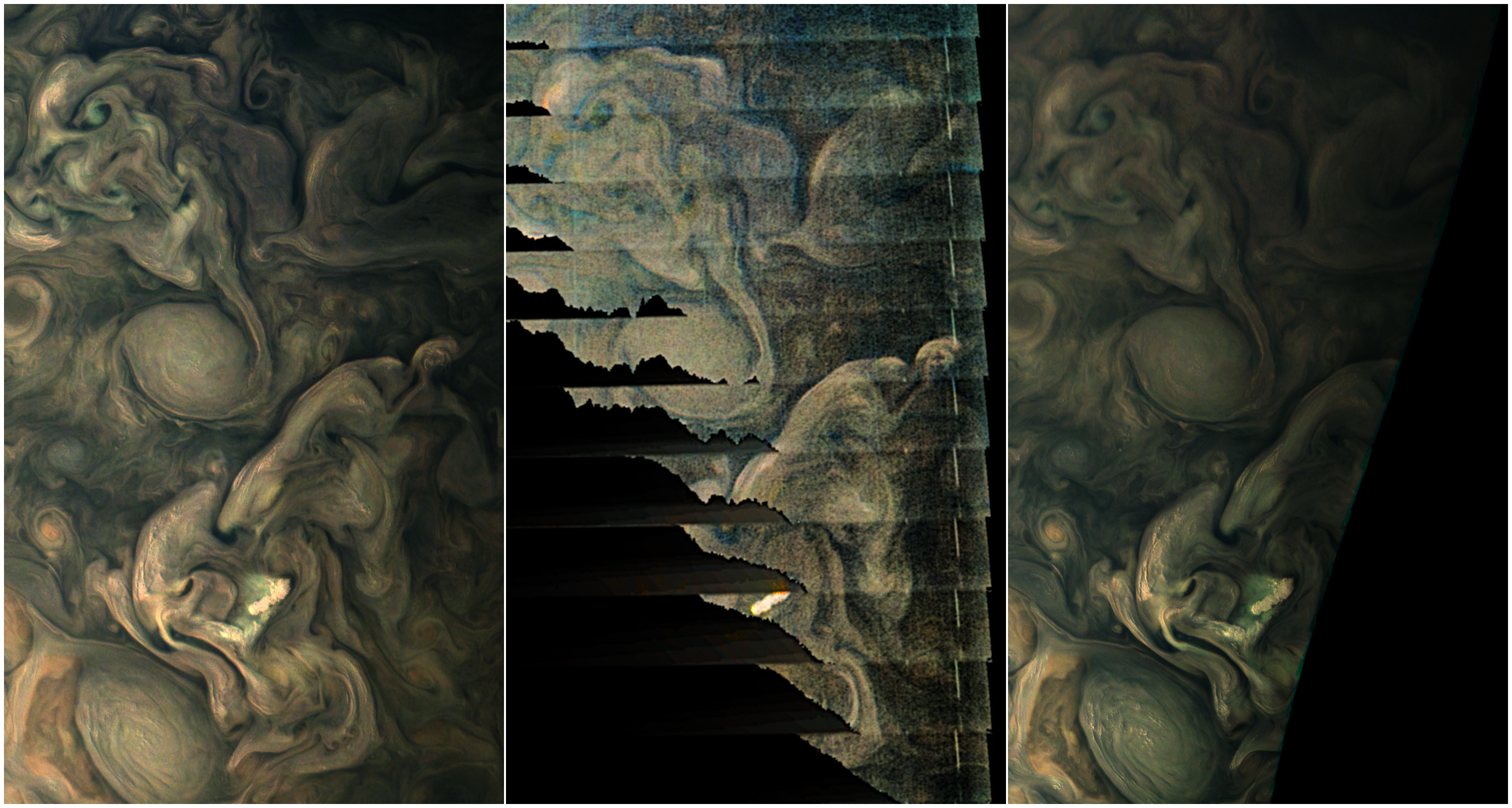The three images are reprojected to Juno's trajectory position at 2018-04-01T09-30-00.000. This allows comparing the two PJ12 RGB images #82 and #84 with the methane band image #83. The methane band image is partially cleaned from hot pixel artifacts, brightess-stretched in a non-linear way, and colorized with image #82. Parts of the methane image are invalid due to stray light and/or a light leak.