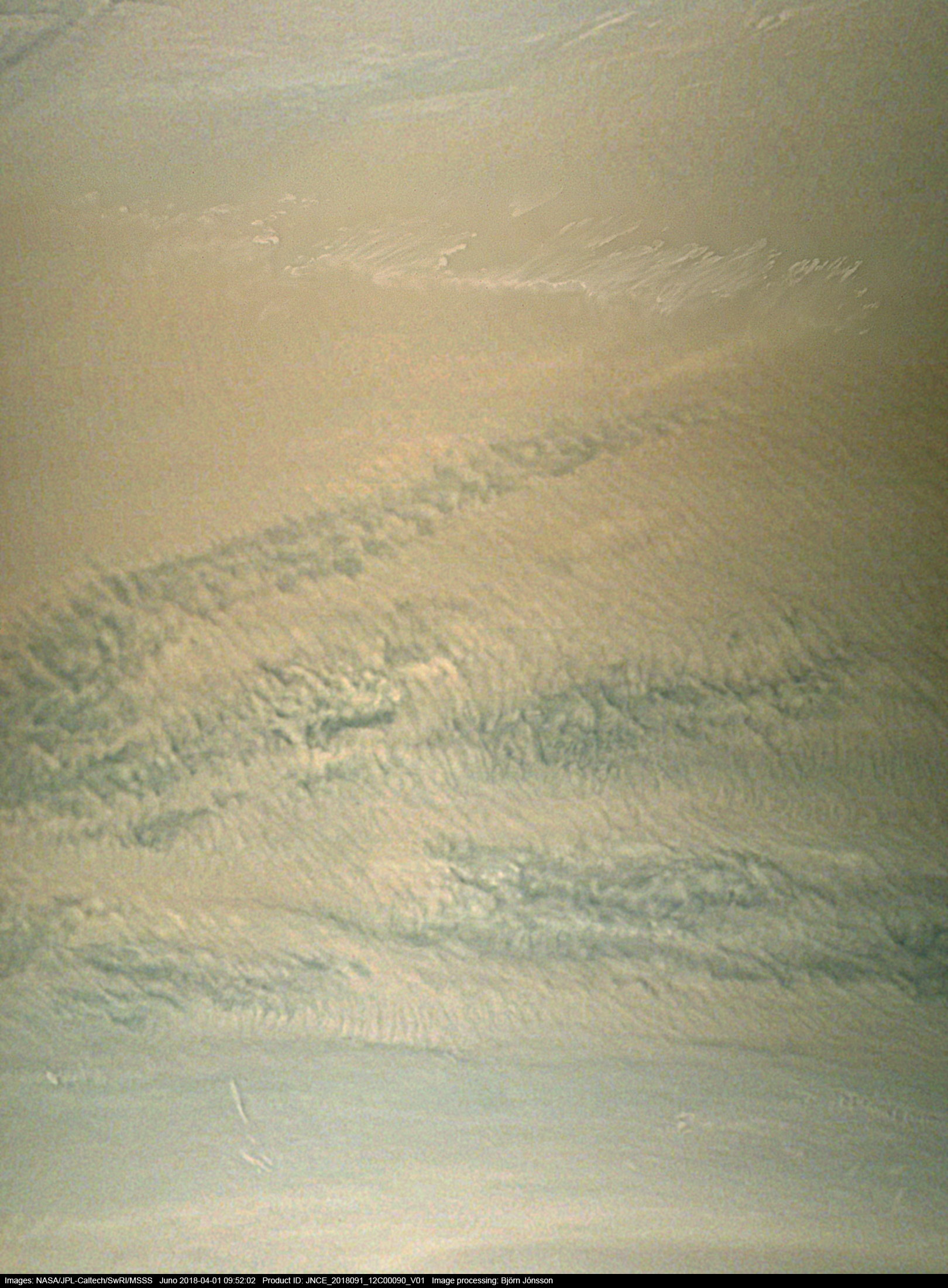This image has been specially filtered and enhanced to increase the visibility of the mesoscale waves that are present in the pale orange Equatorial Band (EB) within the Equatorial Zone (EZ). Bright clouds are also visible near the top of the image. To avoid 'saturating' the bright clouds, the processing of the area containing these clouds differs from the processing elsewhere in the image (in particular, more 'gentle' filtering was used).