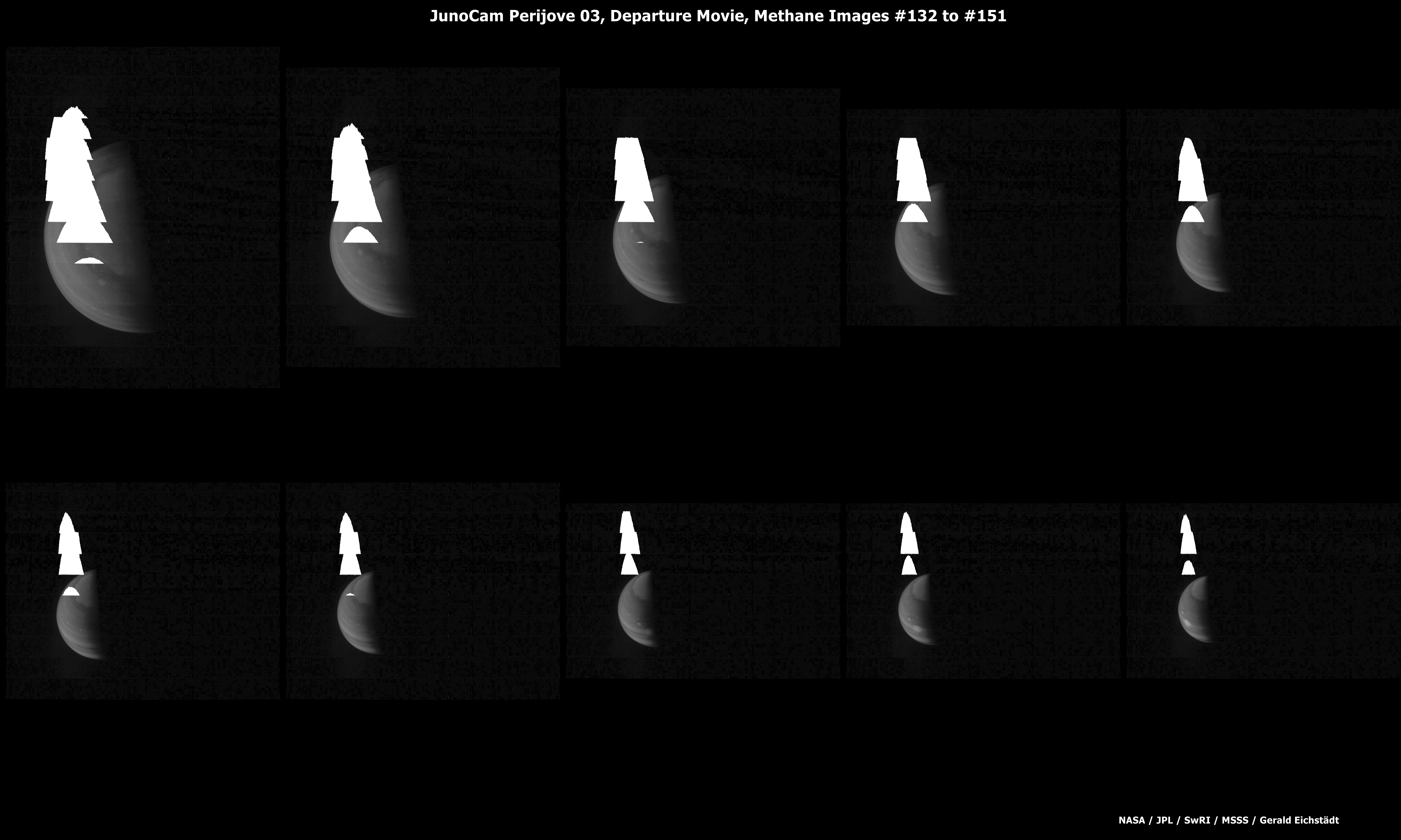 The first 10 methane band images after the PJ03 close-ups. The large white patches are caused by light leaks / stray light under the methane band filter on the CCD. Most of the less prominent vertical lines are an effect of hot camera pixels; the hot pixels are replicated vertically by the TDI mechanism required to avoid motion blur in long-exposure images made by JunoCam rotating together with spinning Juno.