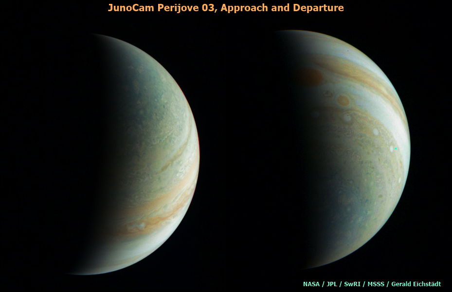 Jupiter about 4 hours before and 5 hours after perijove-3 on 2016-12-11. Images are saturation-enhanced and brightness-stretched, derived from JunoCam's raw PJ03 RGB images #82 and #146.