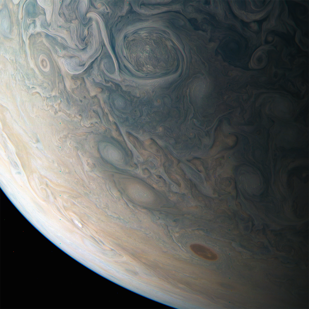 Junocam pixels are 12 bits deep from the camera but are converted to 8 bits inside the instrument using a lossless "companding" table, a process similar to gamma correction, to reduce their size. All Junocam products on the missionjuno website are in this 8-bit form as received on Earth. Scientific users interested in radiometric analysis should use the "RDR" data products archived with the Planetary Data System, which have been converted back to a linear 12-bit scale.